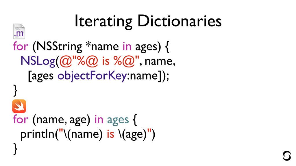 %@", name, [ages objectForKey:name]); } ! for (name, age) in ages { println("\(name) is \(age)") }