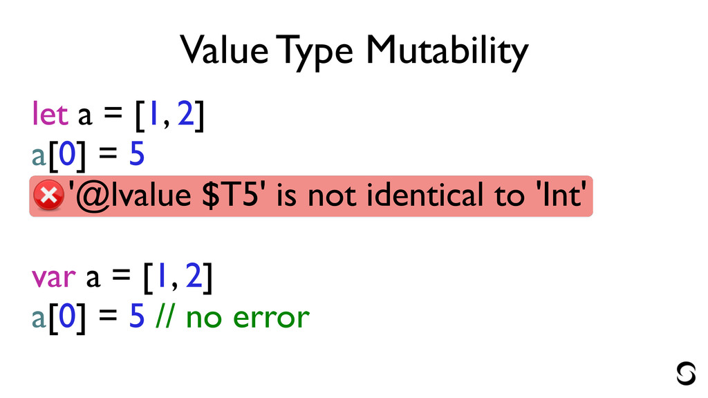 5 '@lvalue $T5' is not identical to 'Int' ! var a = [1, 2] a[0] = 5 // no error