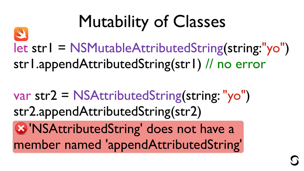 Mutability of Classes let str1 = NSMutableAttributedString(string:"yo") str1.appendAttributedString(str1) // no
