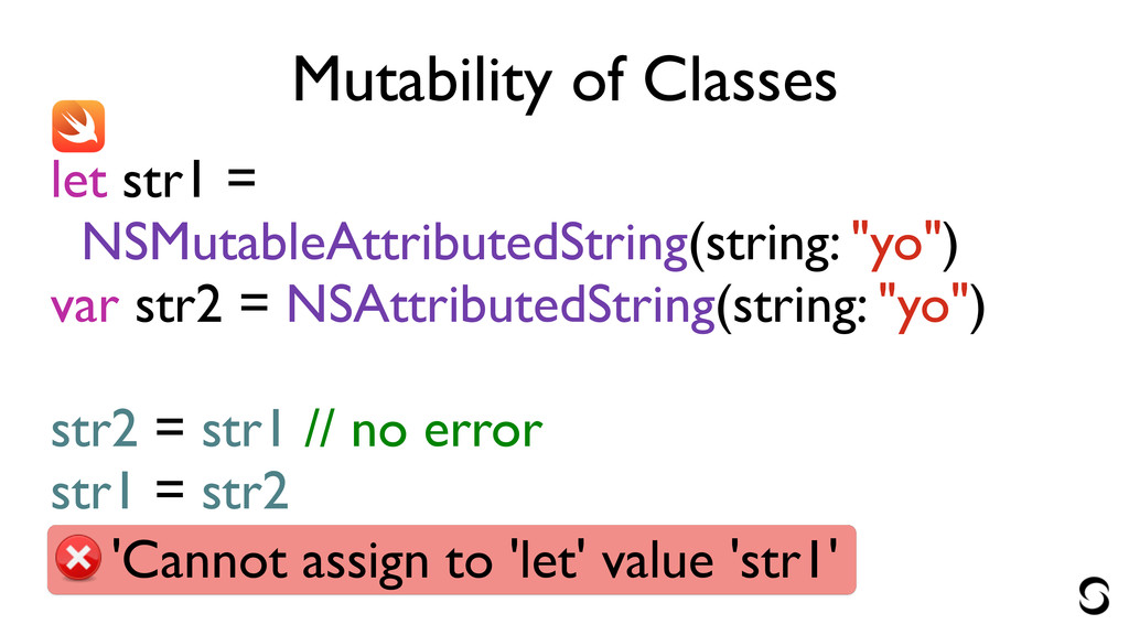 Mutability of Classes let str1 = NSMutableAttributedString(string: "yo") var str2