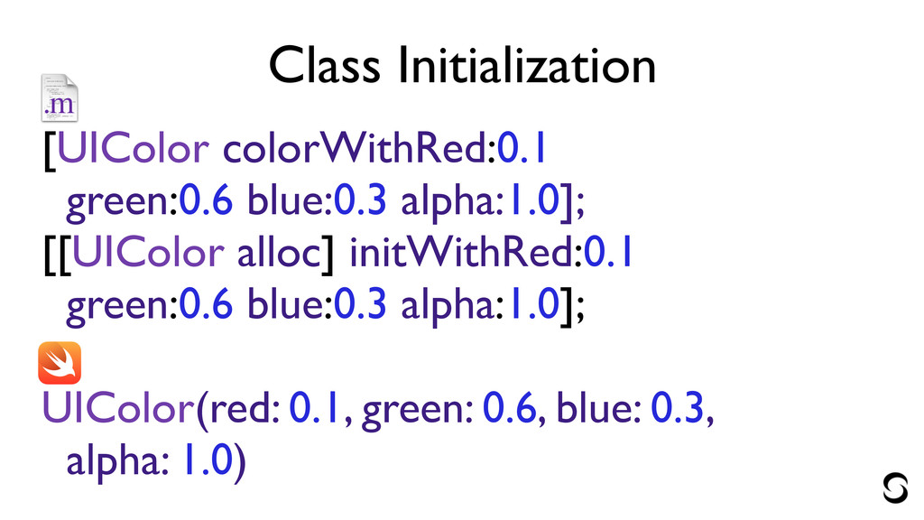 Class Initialization [UIColor colorWithRed:0.1 green:0.6 blue:0.3 alpha:1.0]; [[UIColor alloc] initWithRed:0.1