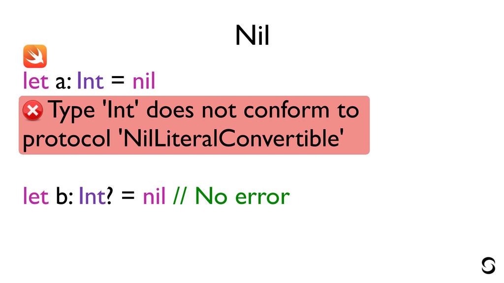conform to protocol 'NilLiteralConvertible' ! let b: Int? = nil // No error