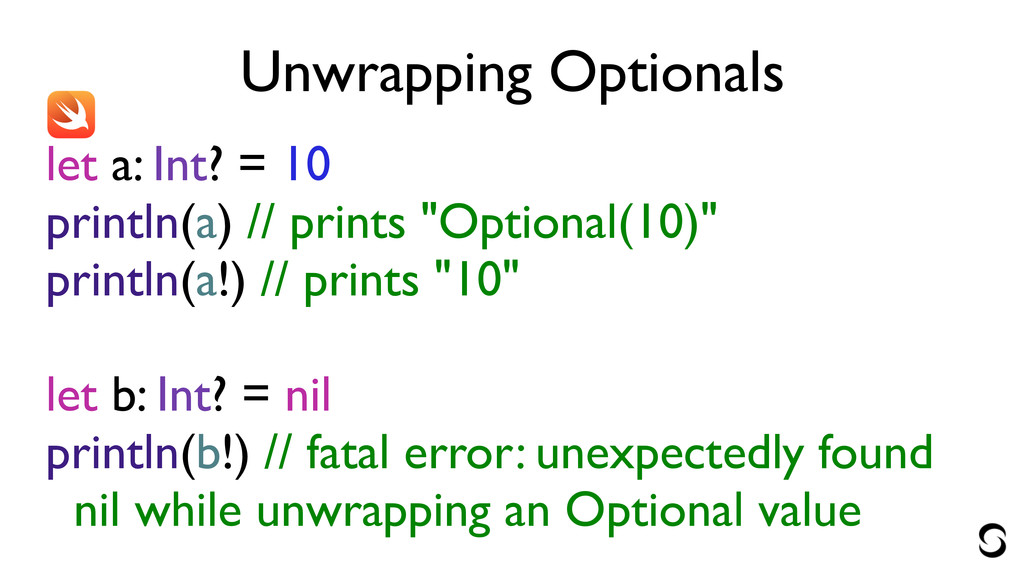 "Optional(10)" println(a!) // prints "10" ! let b: Int? = nil println(b!) // fatal error: unexpectedly found nil while unwrapping an Optional value