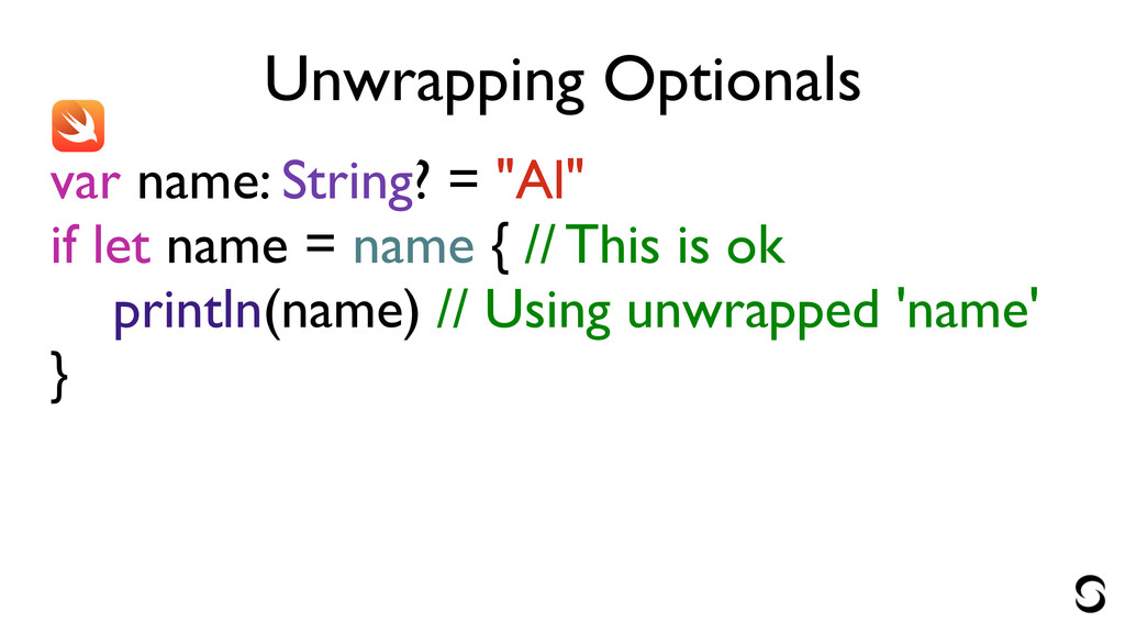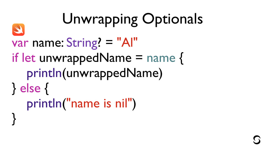 Unwrapping Optionals var name: String? = "Al" if let unwrappedName