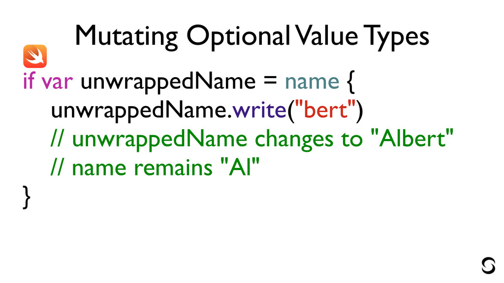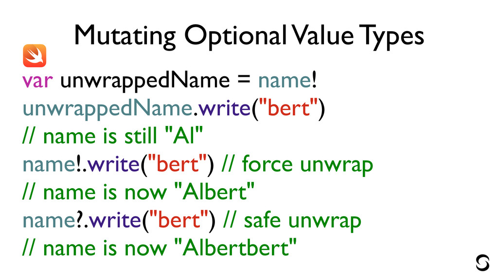 Mutating Optional Value Types var unwrappedName = name! unwrappedName.write("bert") //
