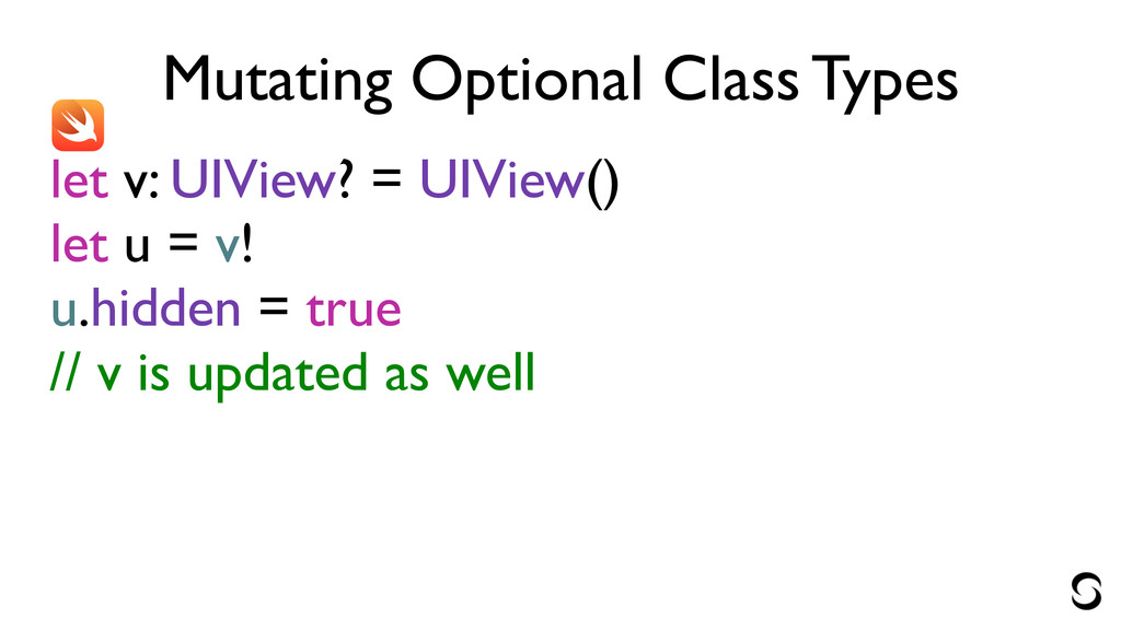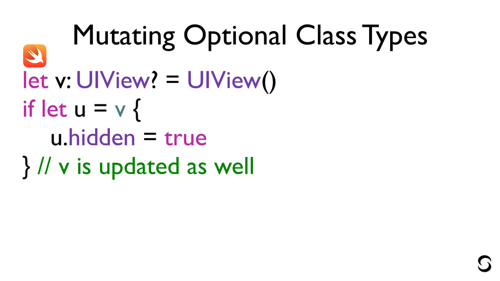 Mutating Optional Class Types let v: UIView? = UIView() if