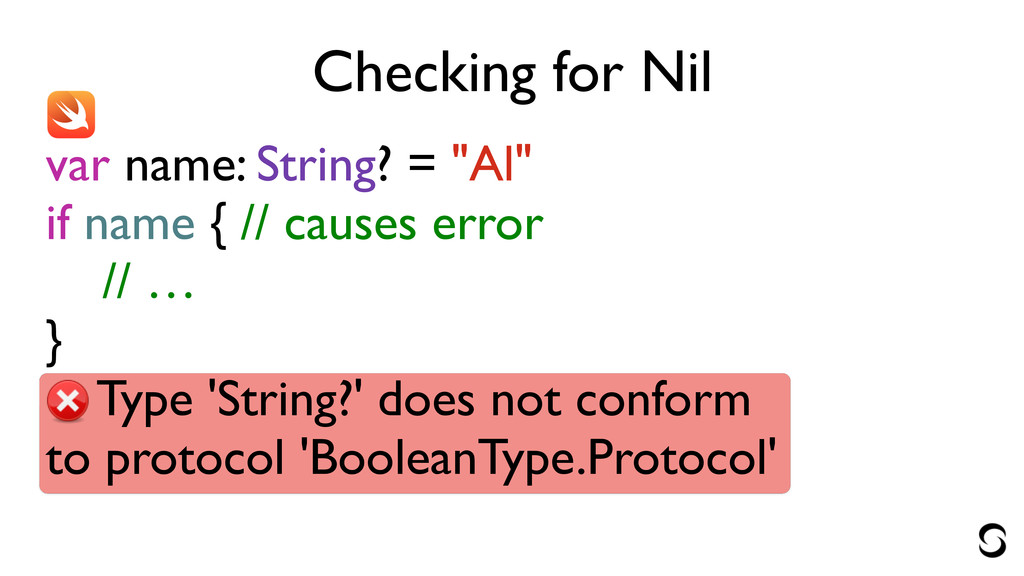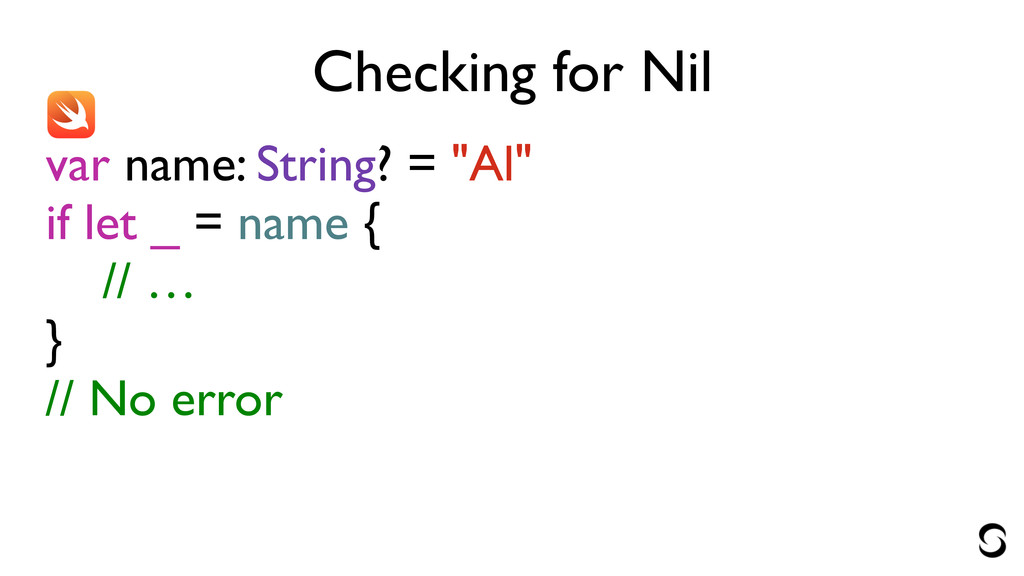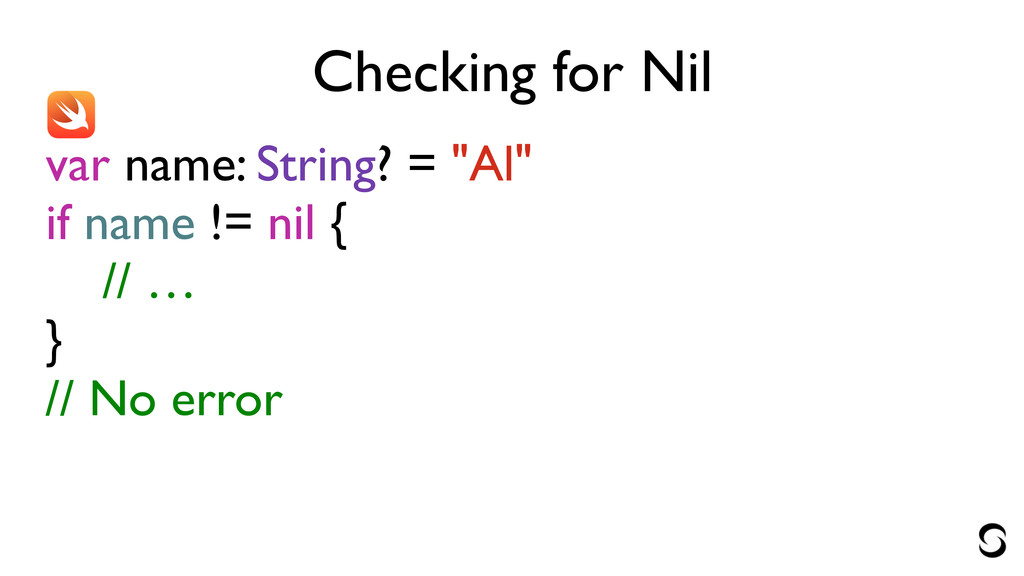 Checking for Nil var name: String? = "Al" if name