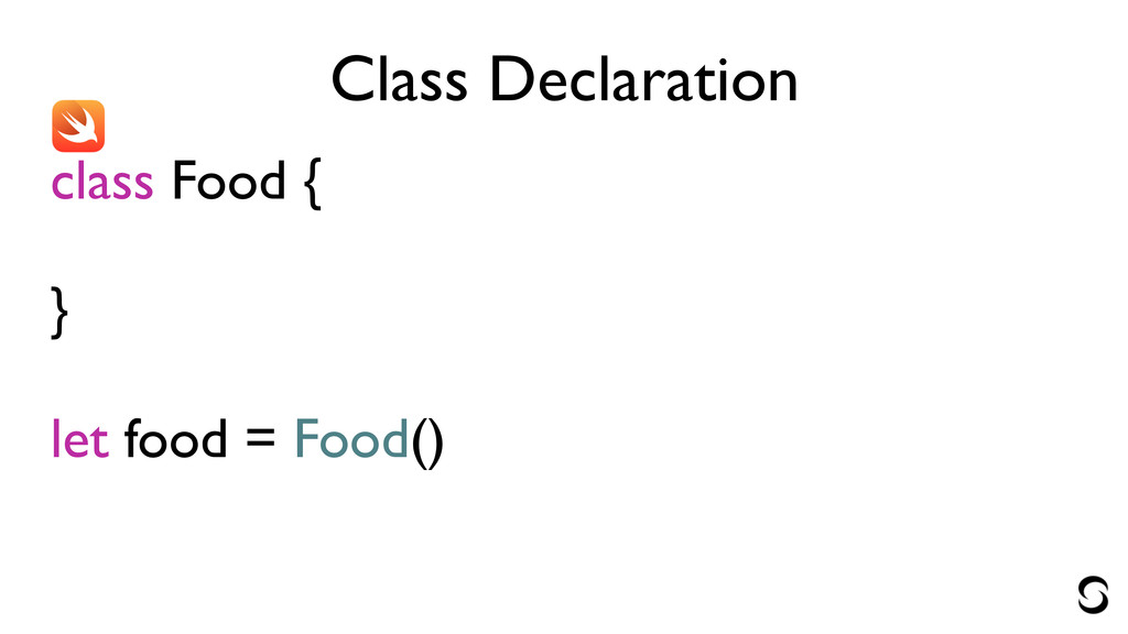 Class Declaration class Food { ! } ! let food