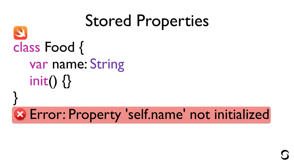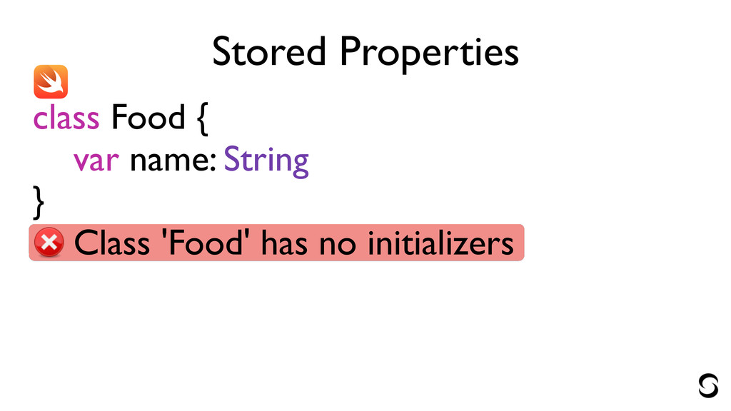 Stored Properties class Food { var name: String init() {}