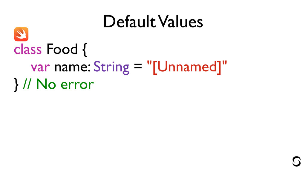 Default Values class Food { var name: String = "[Unnamed]"