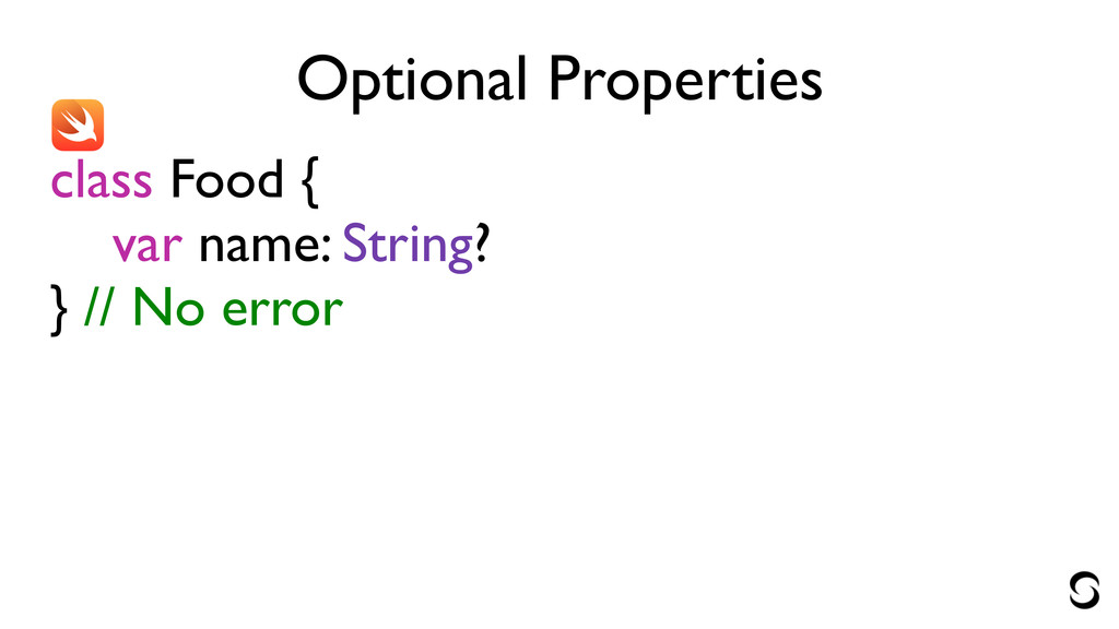 Optional Properties class Food { var name: String? } //