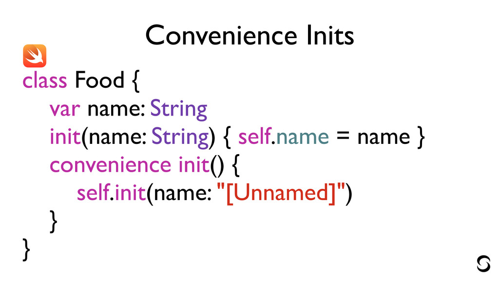 Convenience Inits class Food { var name: String init(name: String)