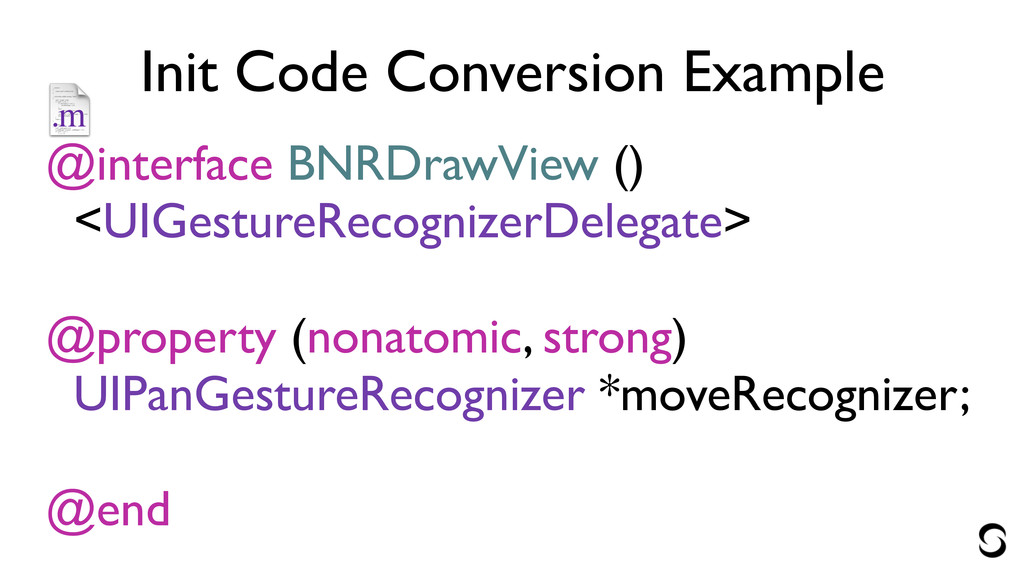 Init Code Conversion Example @interface BNRDrawView () <UIGestureRecognizerDelegate> ! @property