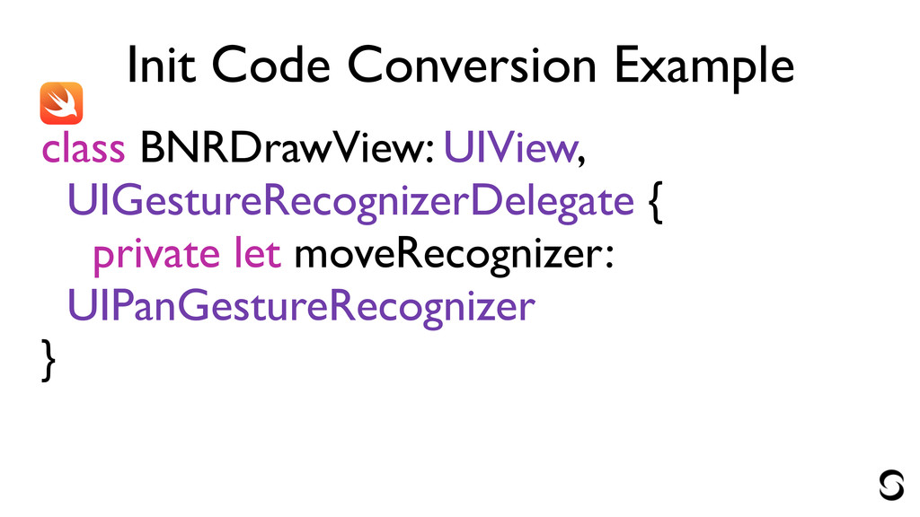 Init Code Conversion Example class BNRDrawView: UIView, UIGestureRecognizerDelegate { private