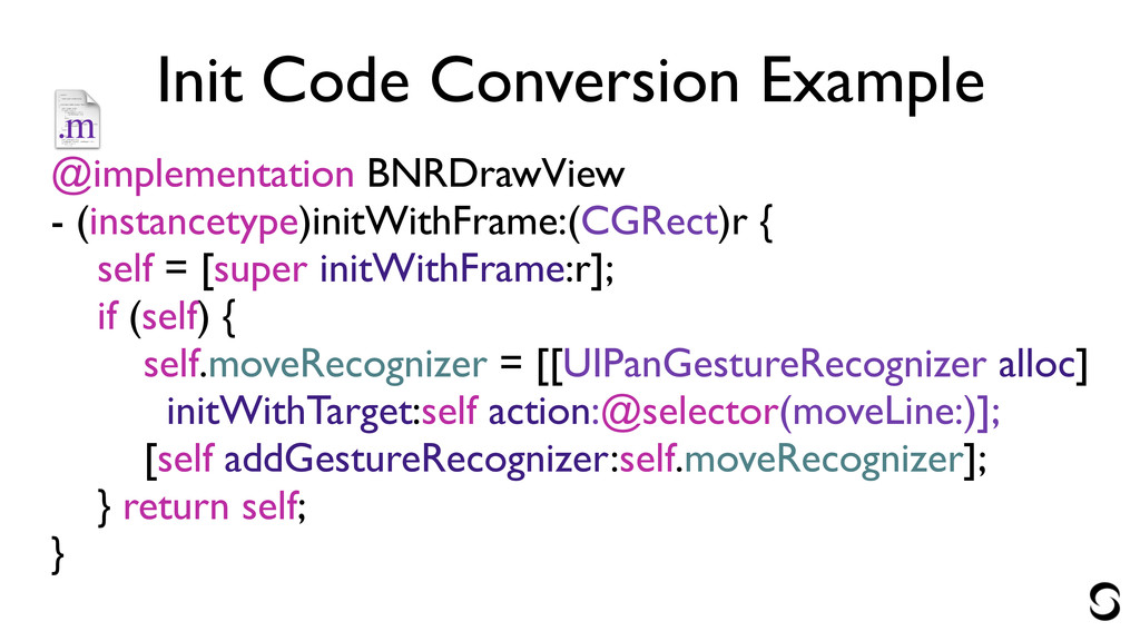 Init Code Conversion Example @implementation BNRDrawView - (instancetype)initWithFrame:(CGRect)r { self