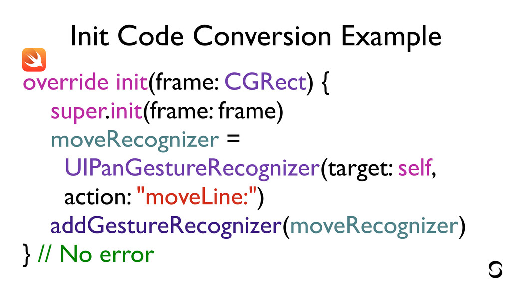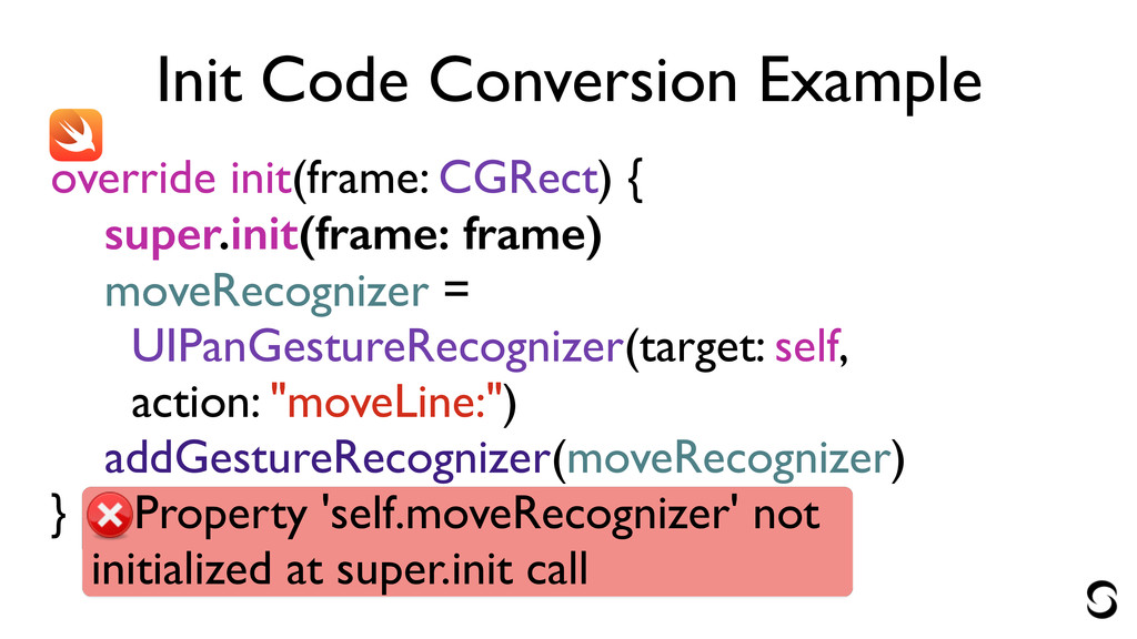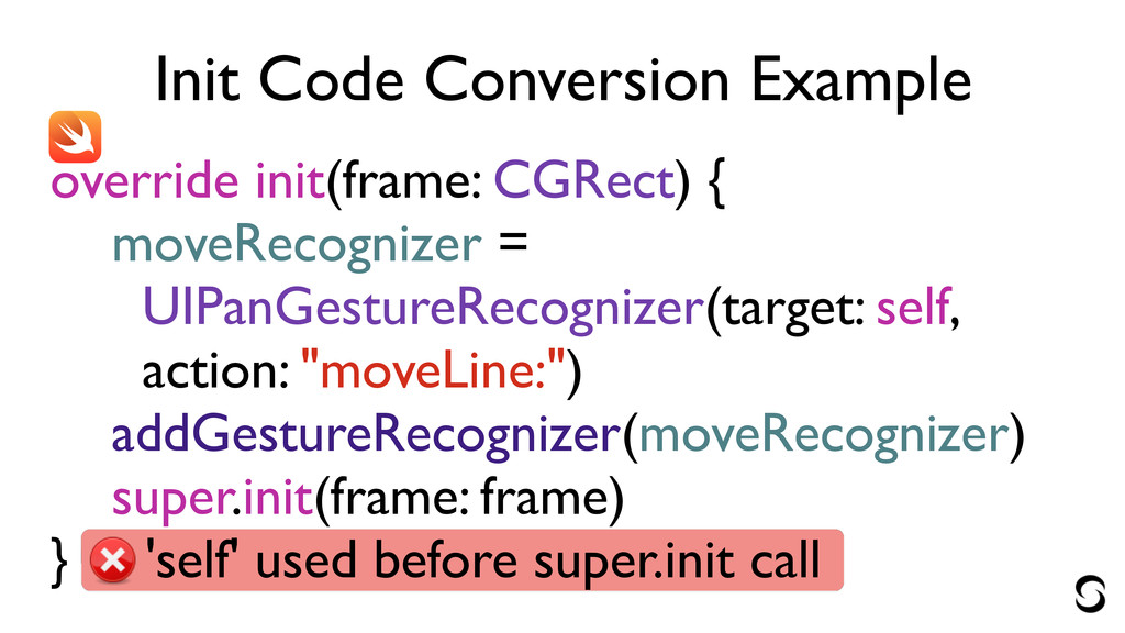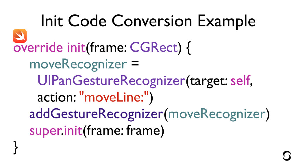 Init Code Conversion Example override init(frame: CGRect) { moveRecognizer =