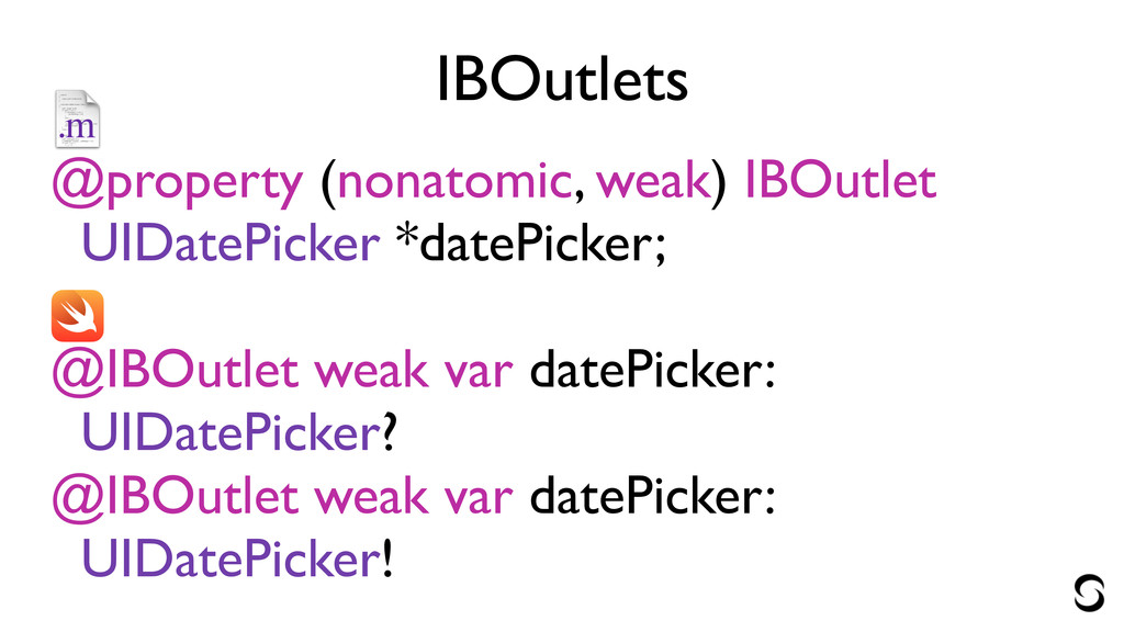 IBOutlets @property (nonatomic, weak) IBOutlet UIDatePicker *datePicker; ! @IBOutlet weak