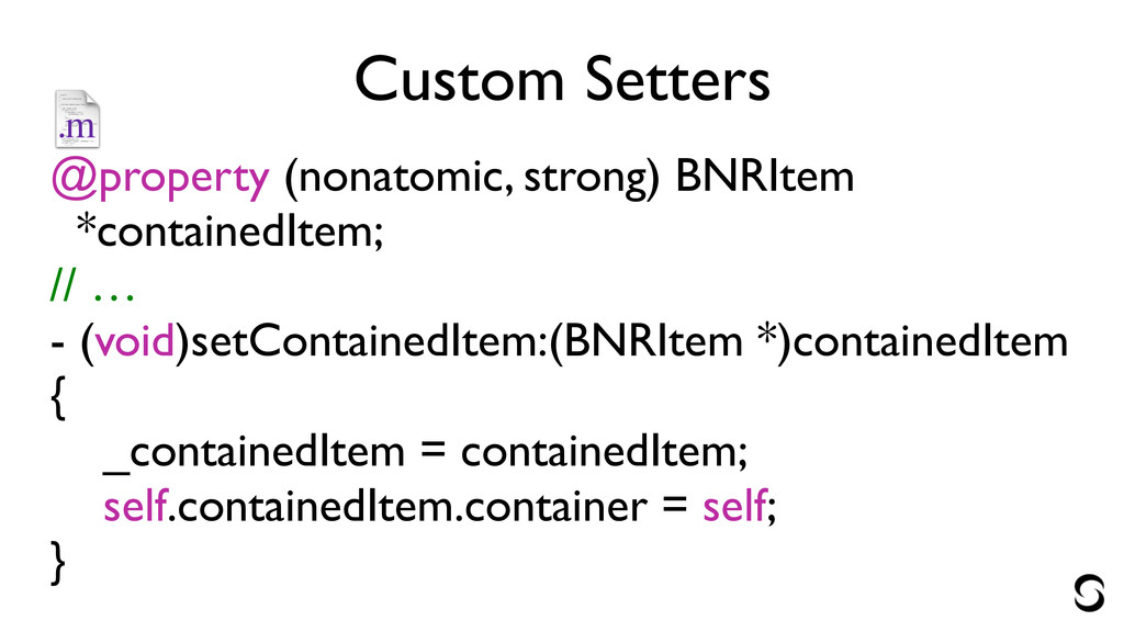 Custom Setters @property (nonatomic, strong) BNRItem *containedItem; // … -