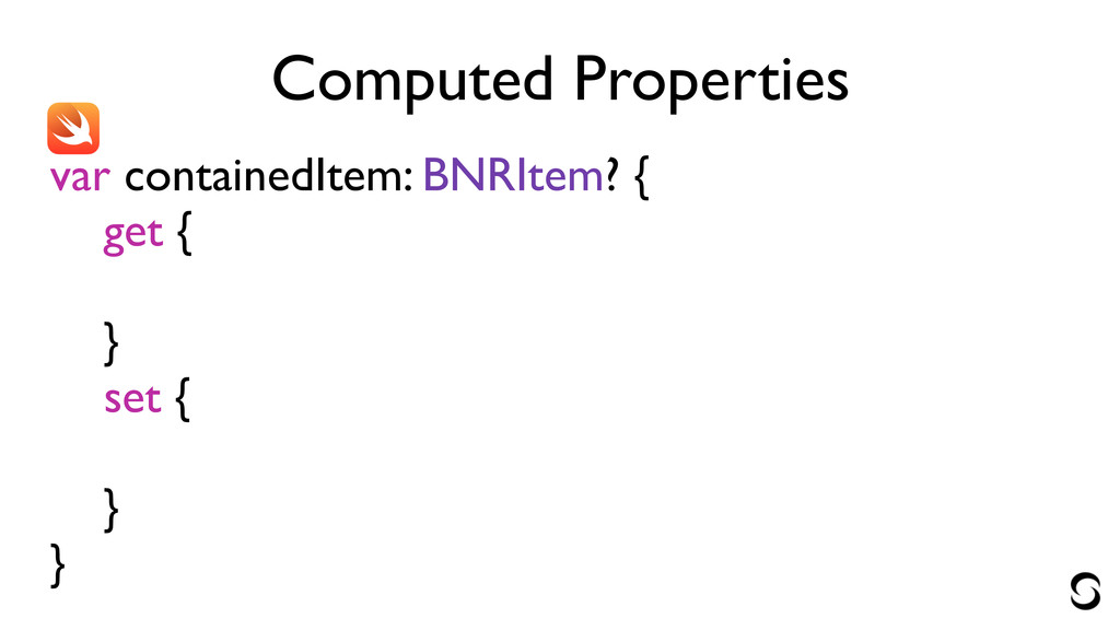 Computed Properties var containedItem: BNRItem? { get { ! }