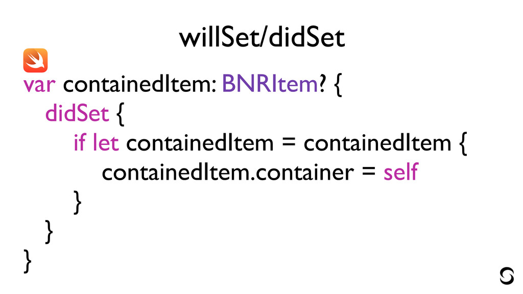 willSet/didSet var containedItem: BNRItem? { didSet { if let containedItem