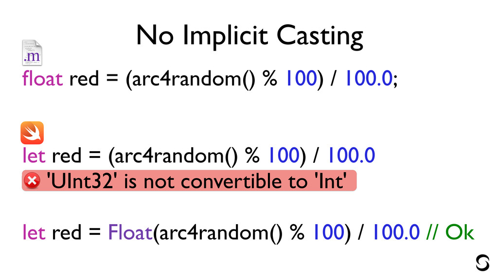 100.0; ! ! let red = (arc4random() % 100) / 100.0 'UInt32' is not convertible to 'Int' ! let red = Float(arc4random() % 100) / 100.0 // Ok
