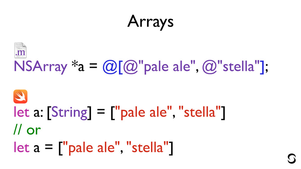 Arrays ! NSArray *a = @[@"pale ale", @"stella"]; ! !