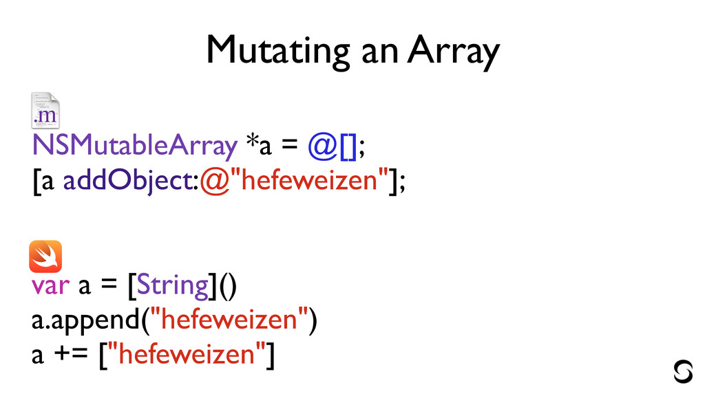 ! ! var a = [String]() a.append("hefeweizen") a += ["hefeweizen"]