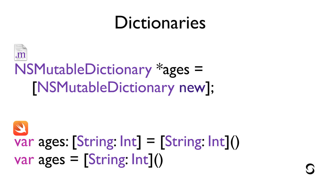 Dictionaries ! NSMutableDictionary *ages = [NSMutableDictionary new]; ! ! var