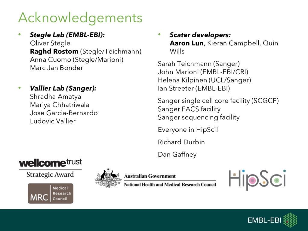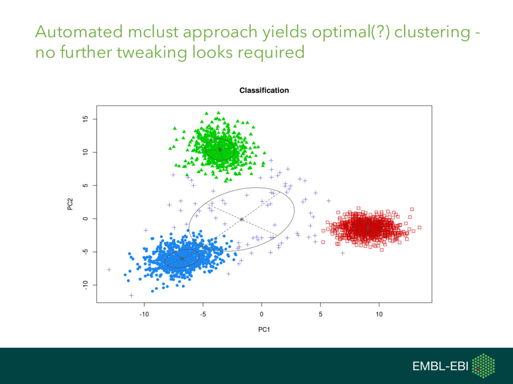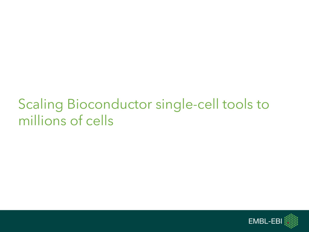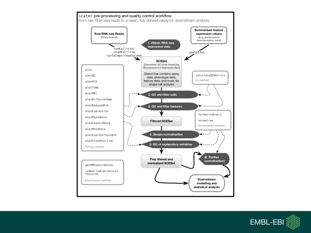 feature data, and more, for single-cell analysis Expression data from e.g. kallisto, Salmon, RSEM, featureCounts, HTSeq, etc. Cell and gene metadata from study design, expression quantification tool, etc. Normalisation BASiCS GRM scran Differential Expression BASiCS BPSC M3Drop MAST monocle scDD scde Heterogeneous Expression BASiCS scran Clustering PAGODA RaceID SC3 SINCERA Latent Variable Analysis cellCODE PEER RUVSeq svaseq Cell Cycle cyclone Pseudotime DeLorean destiny dpt embeddr monocle ouija SINCELL TSCAN scater ecosystem: take advantage of many other R/Bioconductor packages cf. ExpressionSet, data classes in Seurat, monocle