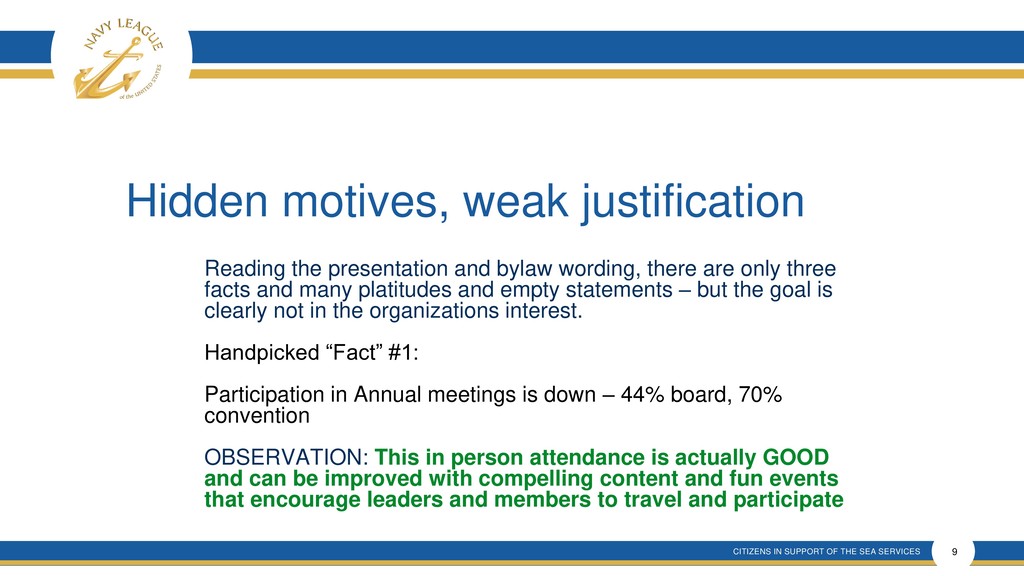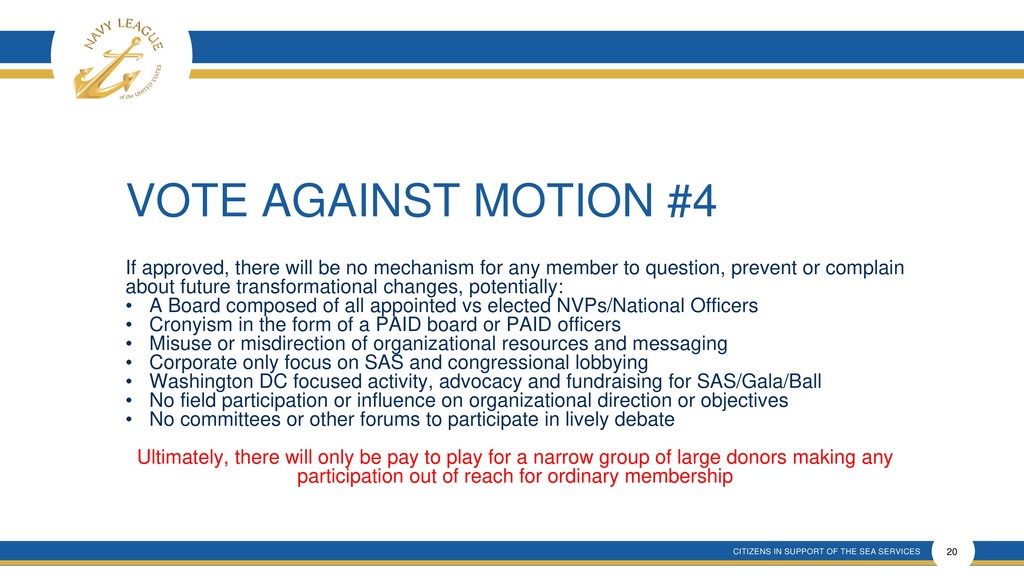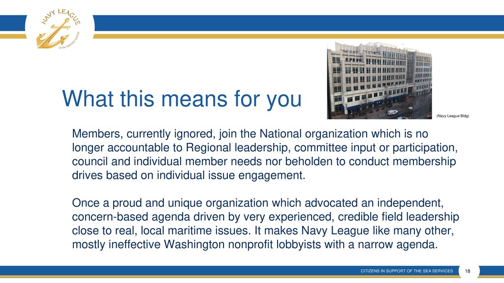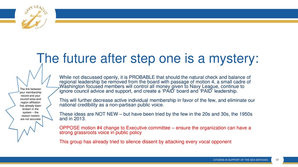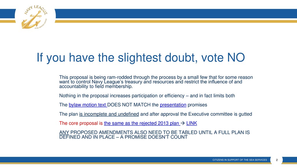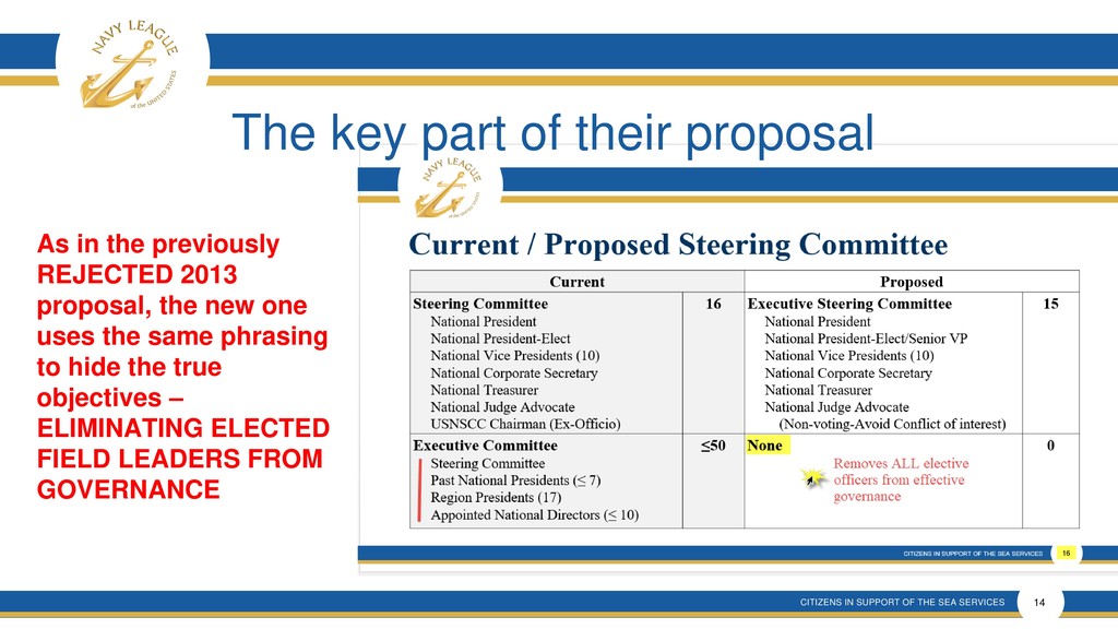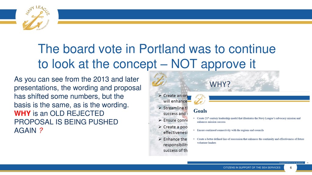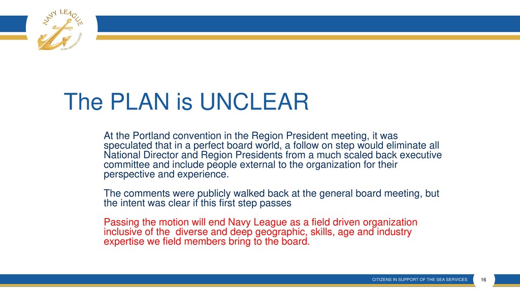 This presentation shows that there is much confusion around the proposal that is a rehash of an old and incomplete plan that will forever remove elected membership representation from the Navy League Board despite verbal promises made.