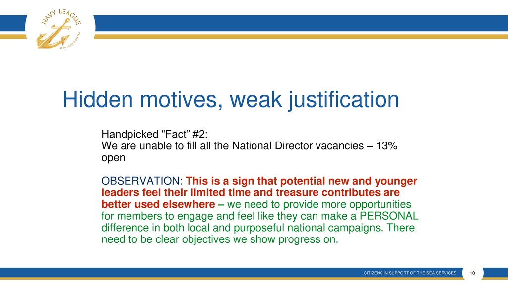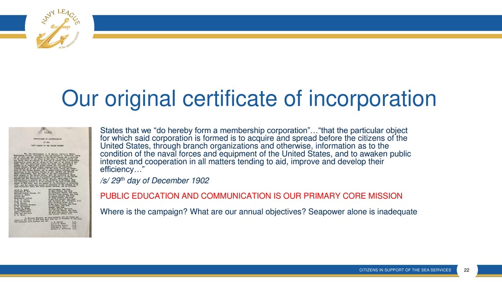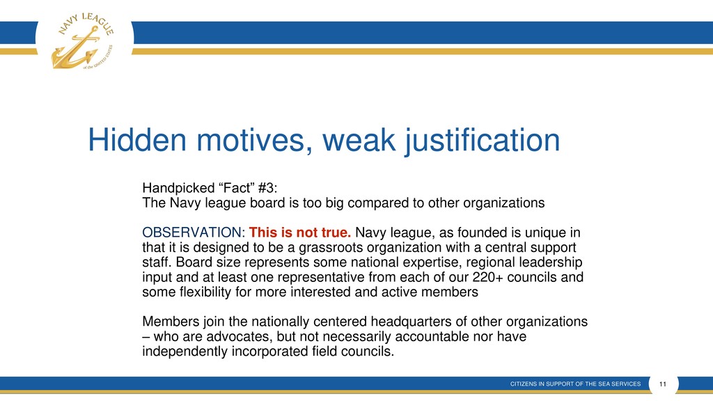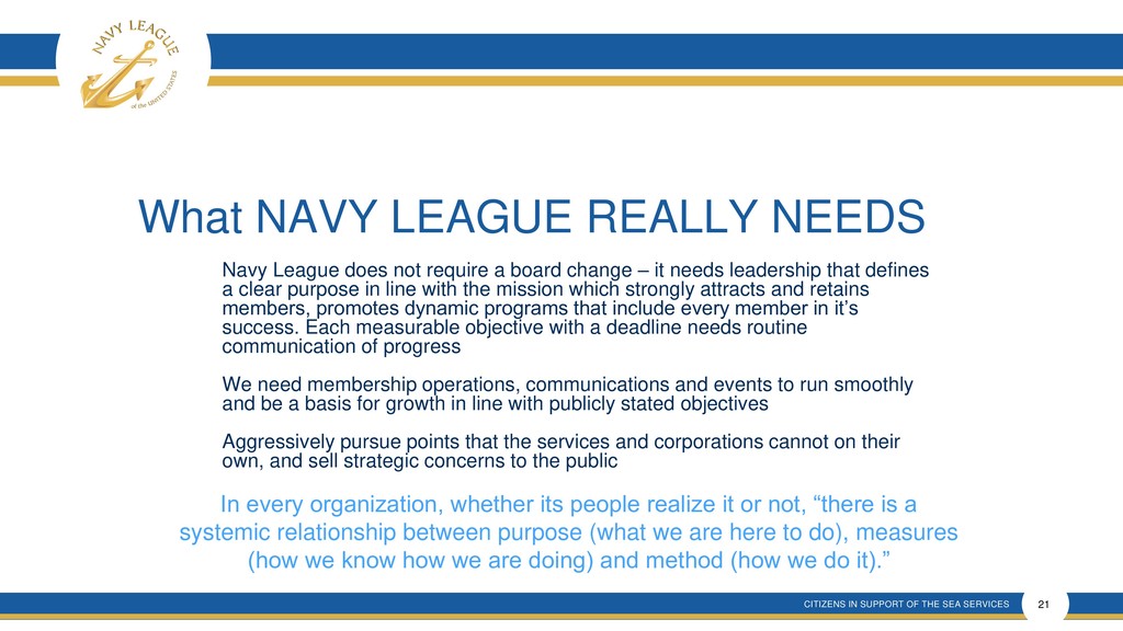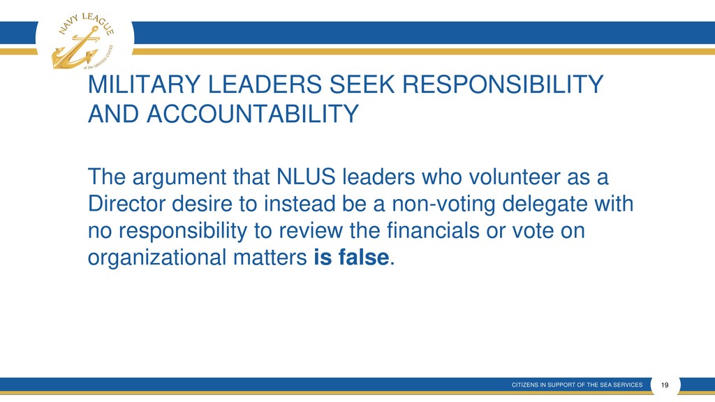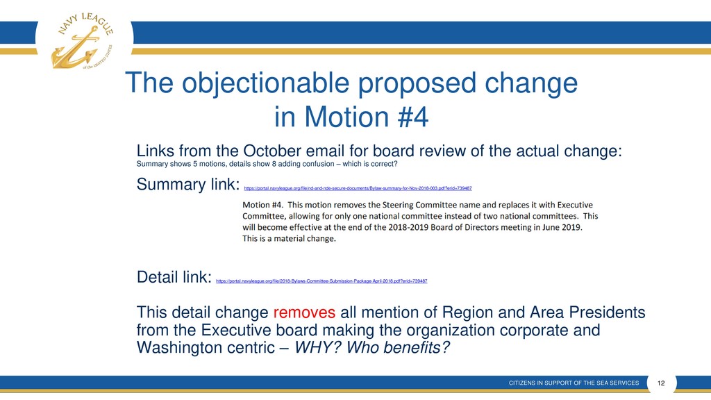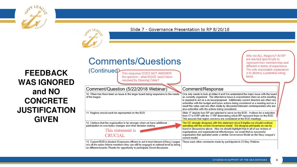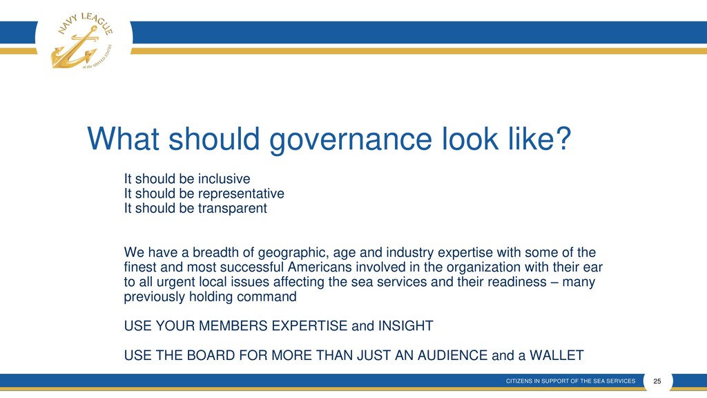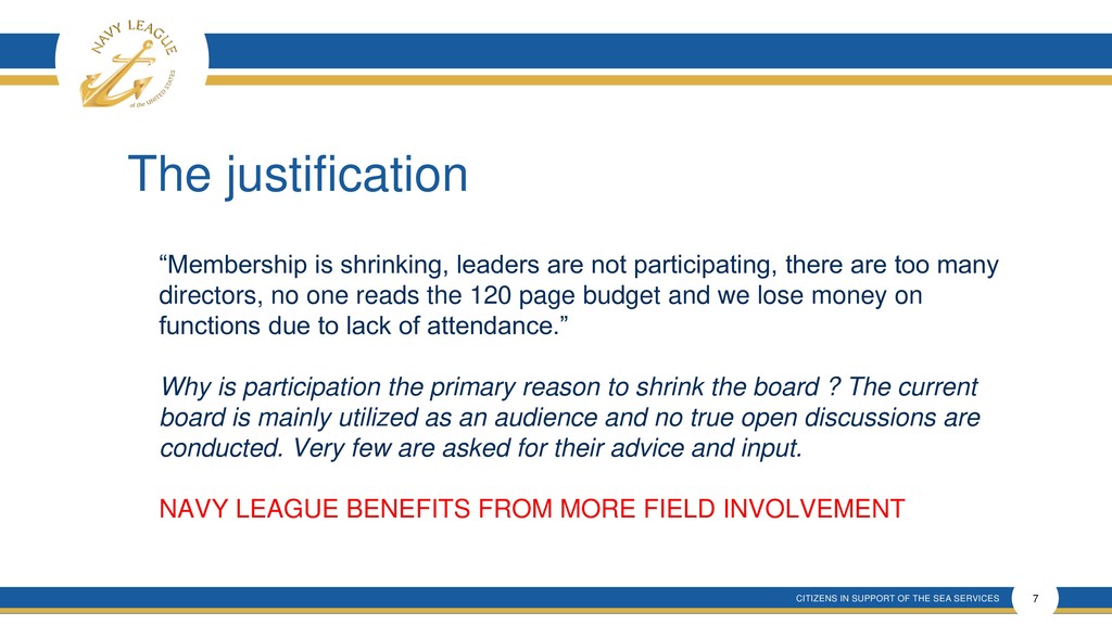 This presentation shows that there is much confusion around the proposal that is a rehash of an old and incomplete plan that will forever remove elected membership representation from the Navy League Board despite verbal promises made.