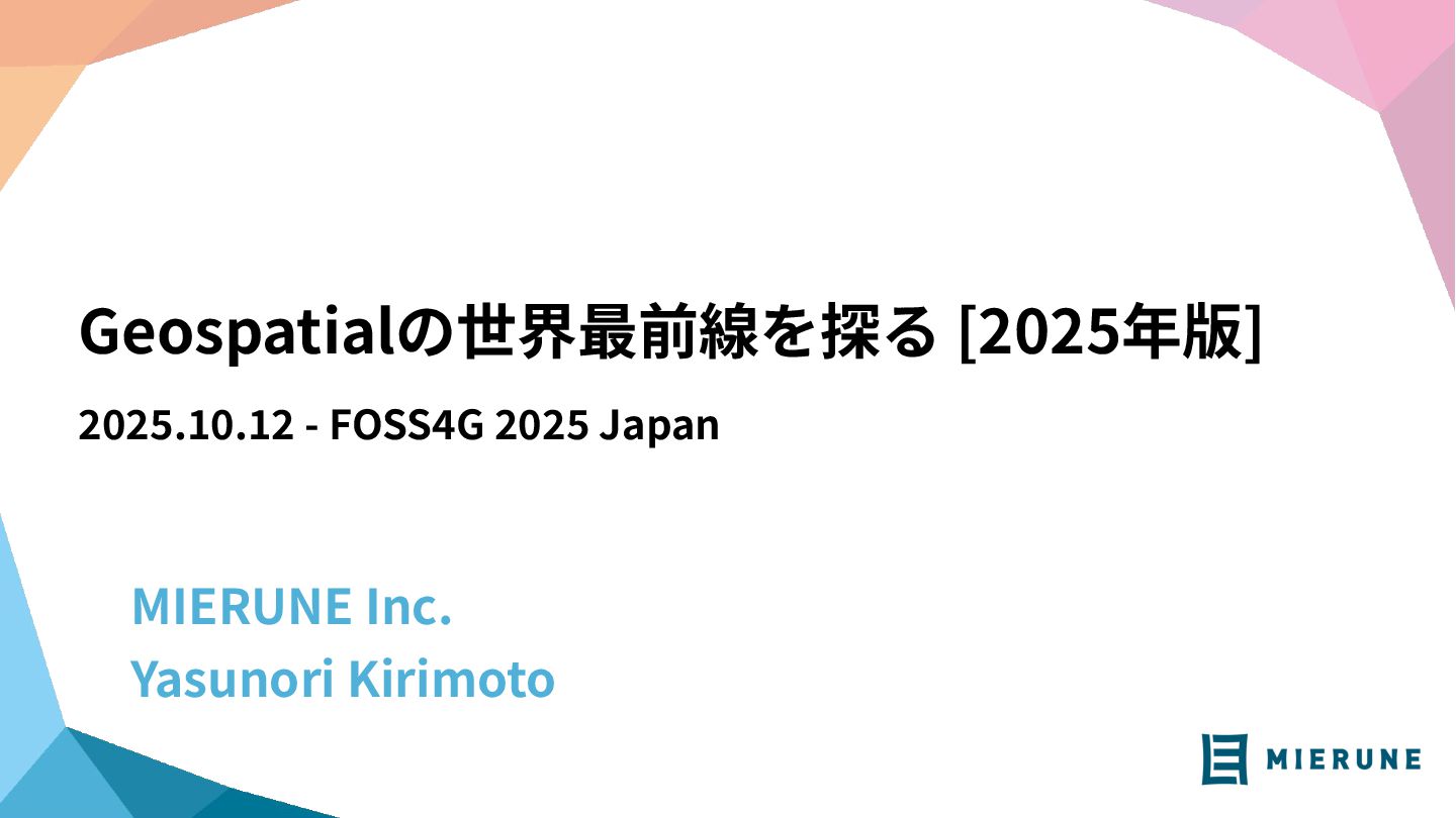 MIERUNE Inc. Yasunori Kirimoto Geospatialの世界最前線を探る [2025年版] 2025.10.12 - FOSS4G 2025