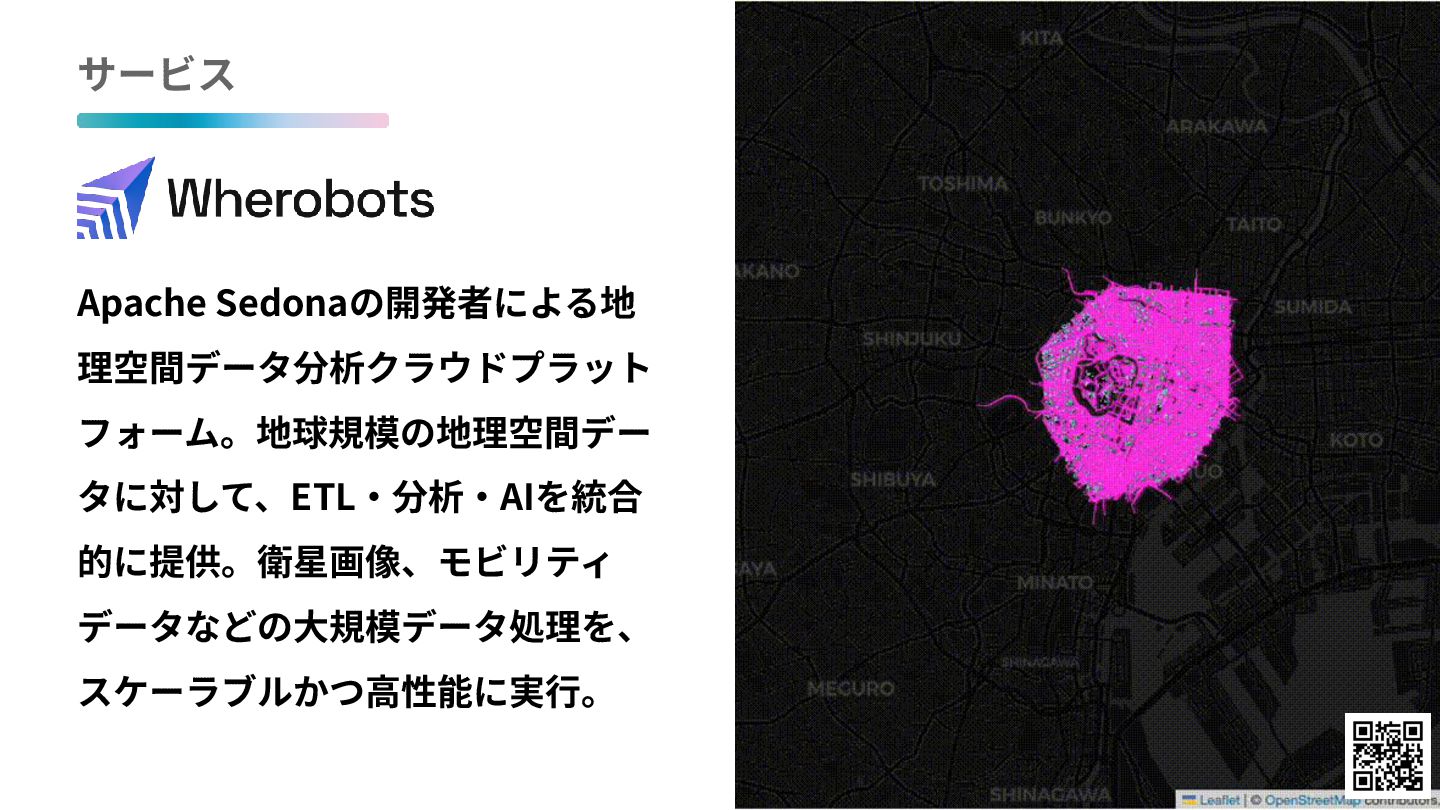 サービス Apache Sedonaの開発者による地 理空間データ分析クラウドプラット フォーム。地球規模の地理空間デー タに対して、ETL‧分析‧AIを統合 的に提供。衛星画像、モビリティ データなどの⼤規模データ処理を、 スケーラブルかつ⾼性能に実⾏。