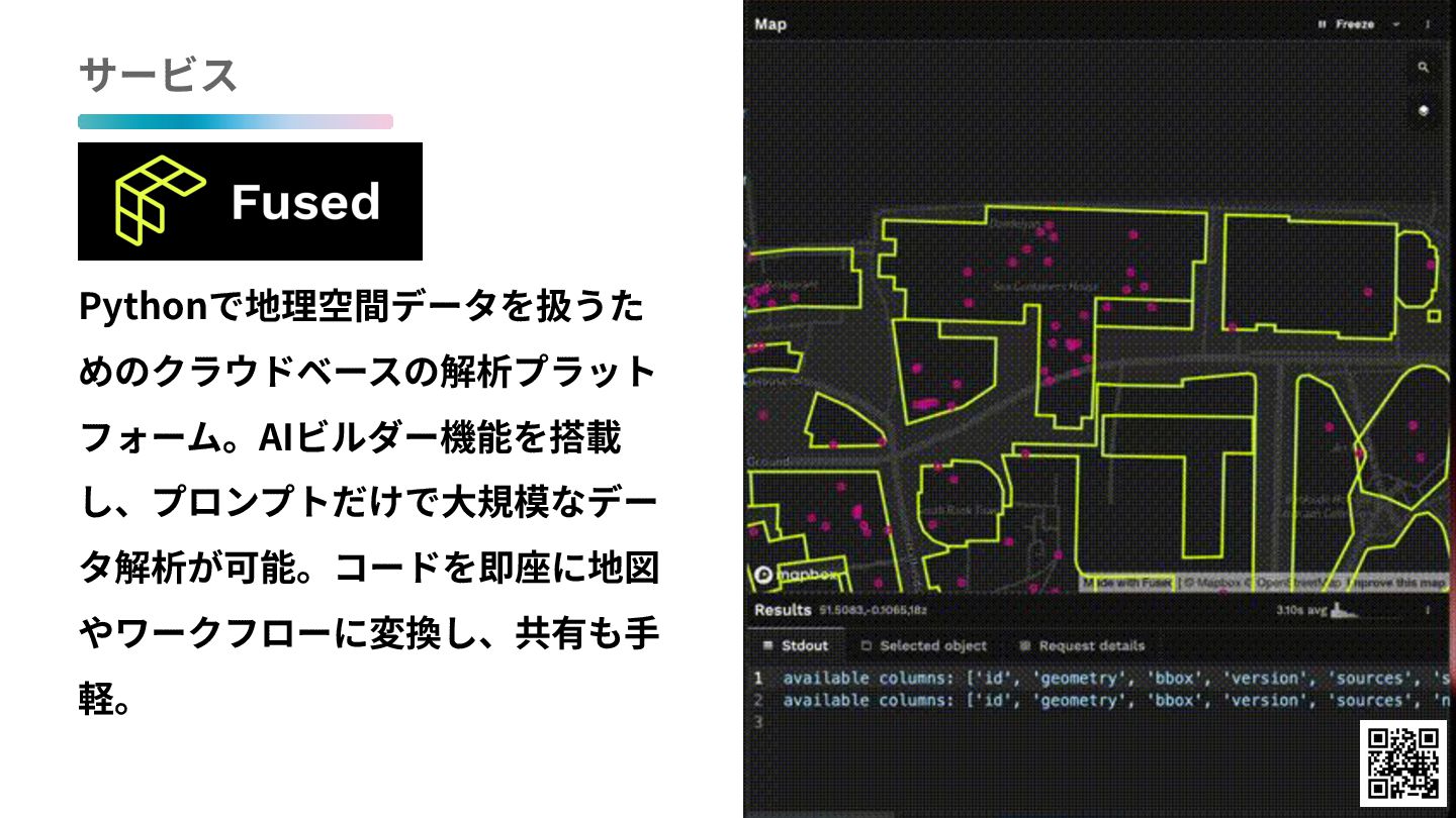 サービス Pythonで地理空間データを扱うた めのクラウドベースの解析プラット フォーム。AIビルダー機能を搭載 し、プロンプトだけで⼤規模なデー タ解析が可能。コードを即座に地図 やワークフローに変換し、共有も⼿ 軽。