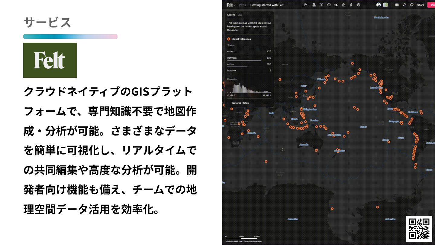 サービス クラウドネイティブのGISプラット フォームで、専⾨知識不要で地図作 成‧分析が可能。さまざまなデータ を簡単に可視化し、リアルタイムで の共同編集や⾼度な分析が可能。開 発者向け機能も備え、チームでの地 理空間データ活⽤を効率化。