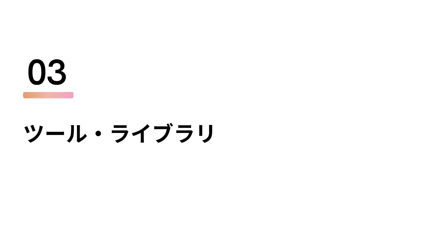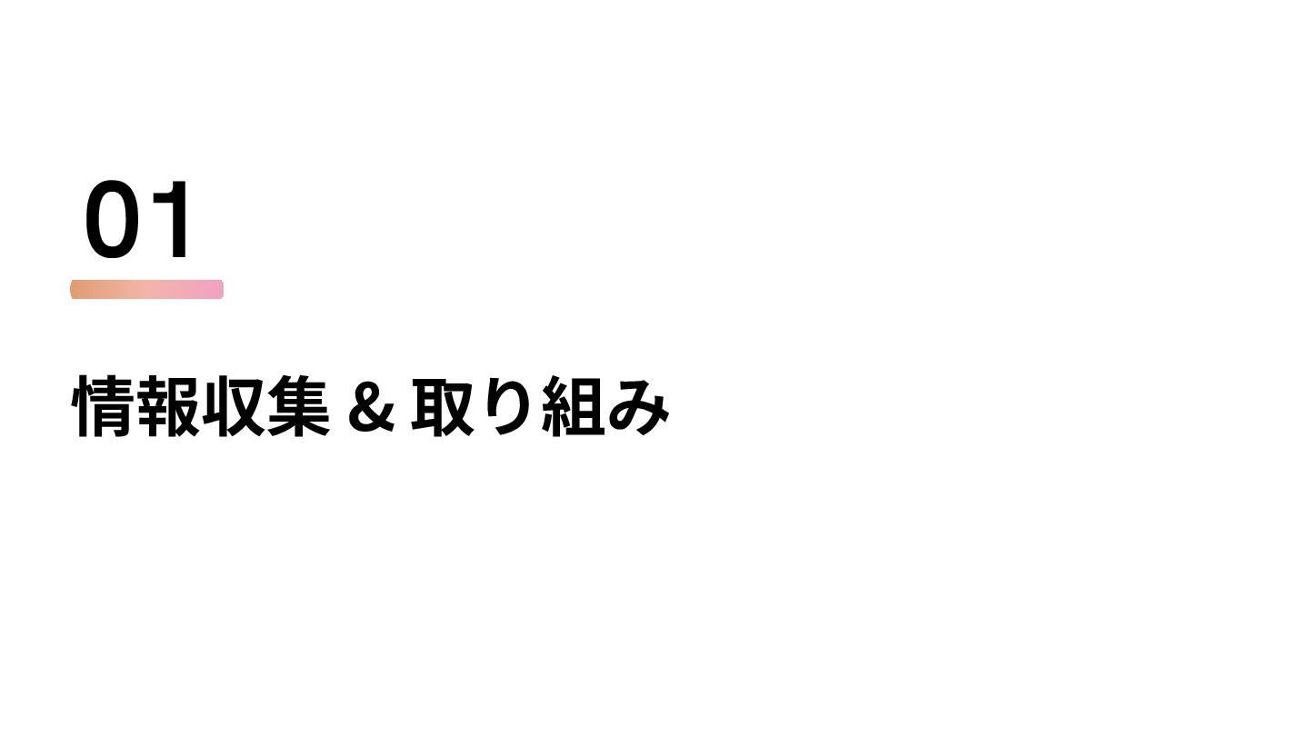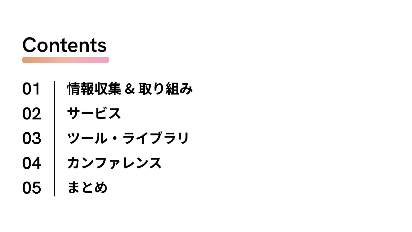 情報収集 & 取り組み サービス ツール‧ライブラリ カンファレンス まとめ Contents 01 02