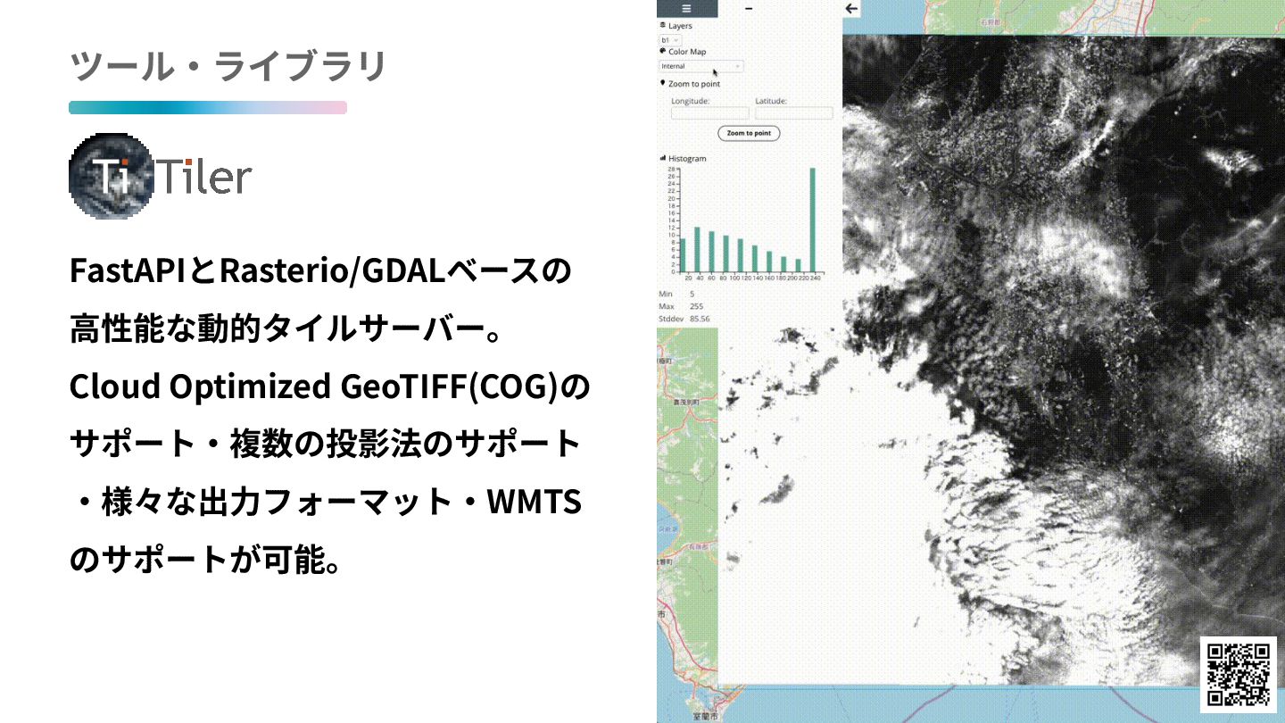 ツール‧ライブラリ FastAPIとRasterio/GDALベースの ⾼性能な動的タイルサーバー。 Cloud Optimized GeoTIFF(COG)の サポート‧複数の投影法のサポート ‧様々な出⼒フォーマット‧WMTS のサポートが可能。