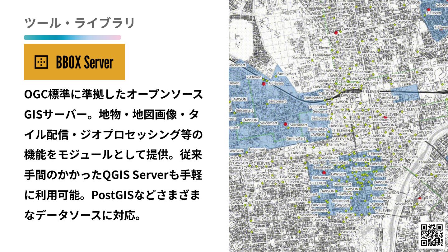 ツール‧ライブラリ OGC標準に準拠したオープンソース GISサーバー。地物‧地図画像‧タ イル配信‧ジオプロセッシング等の 機能をモジュールとして提供。従来 ⼿間のかかったQGIS Serverも⼿軽 に利⽤可能。PostGISなどさまざま なデータソースに対応。