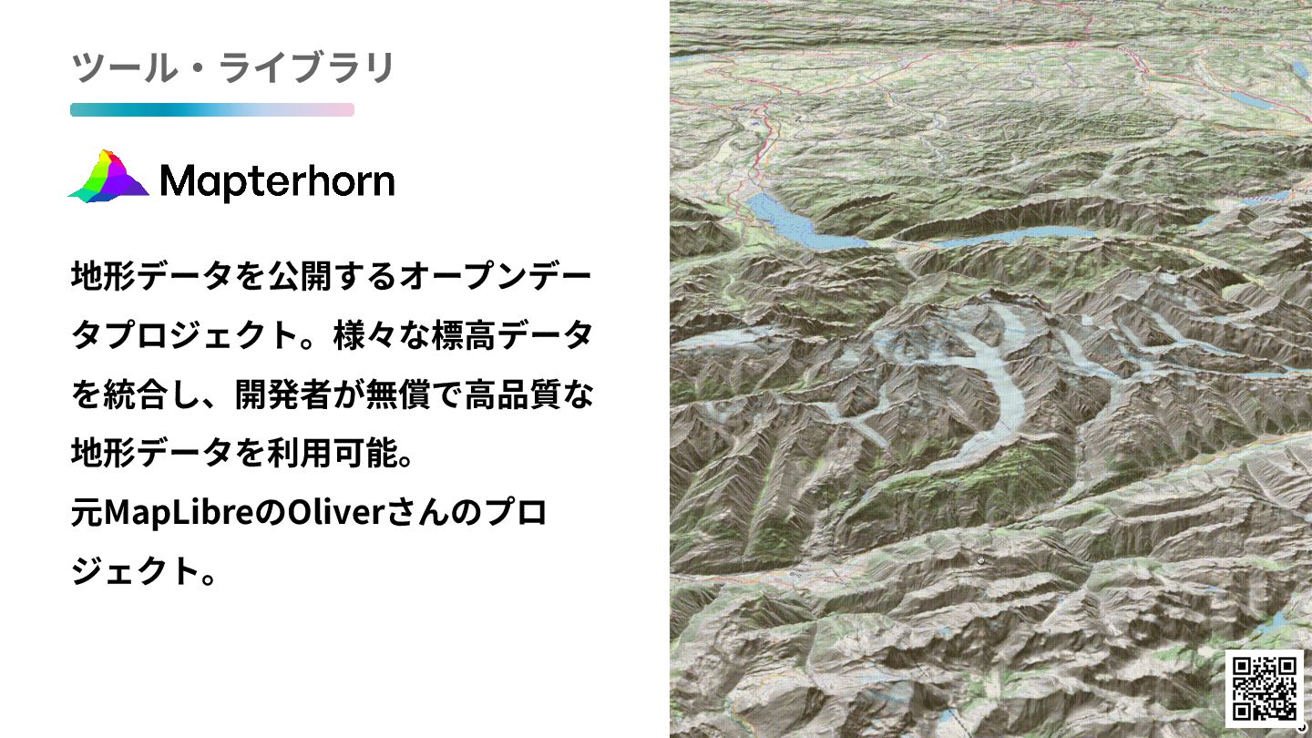 ツール‧ライブラリ 地形データを公開するオープンデー タプロジェクト。様々な標⾼データ を統合し、開発者が無償で⾼品質な 地形データを利⽤可能。 元MapLibreのOliverさんのプロ ジェクト。