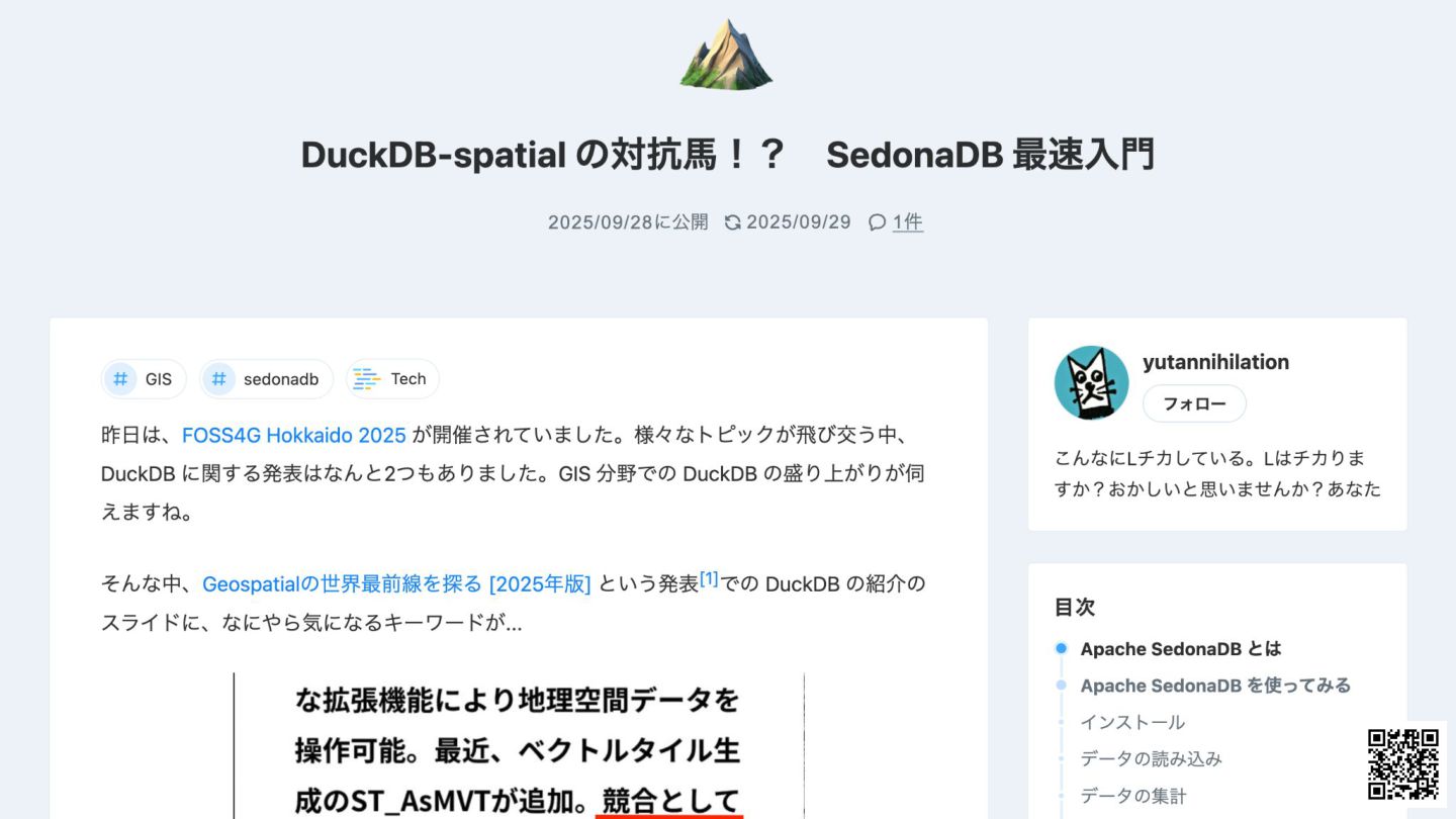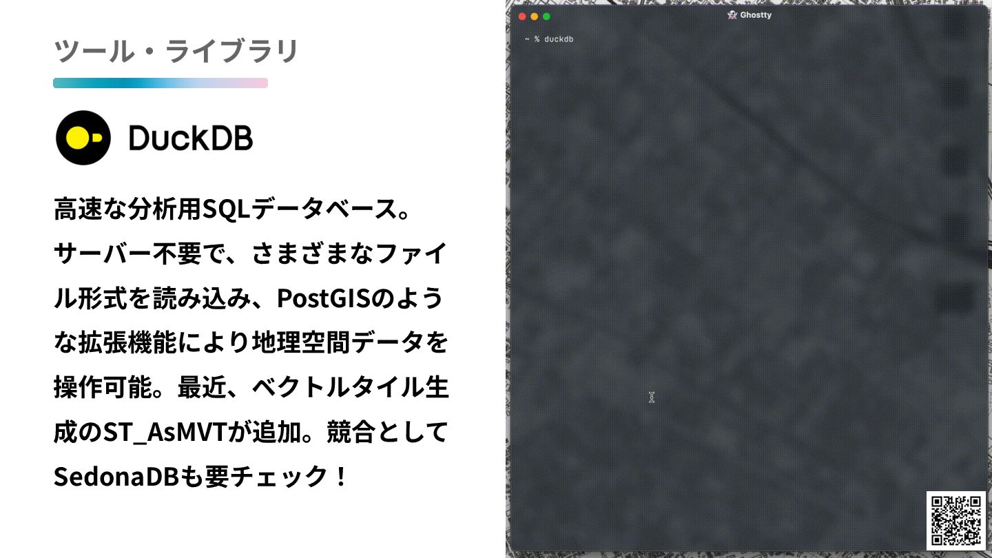 ツール‧ライブラリ ⾼速な分析⽤SQLデータベース。 サーバー不要で、さまざまなファイ ル形式を読み込み、PostGISのよう な拡張機能により地理空間データを 操作可能。最近、ベクトルタイル⽣ 成のST_AsMVTが追加。競合として SedonaDBも要チェック!