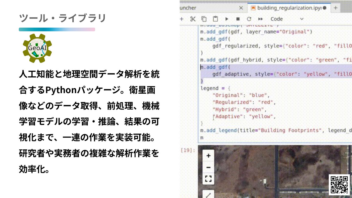ツール‧ライブラリ ⼈⼯知能と地理空間データ解析を統 合するPythonパッケージ。衛星画 像などのデータ取得、前処理、機械 学習モデルの学習‧推論、結果の可 視化まで、⼀連の作業を実装可能。 研究者や実務者の複雑な解析作業を 効率化。