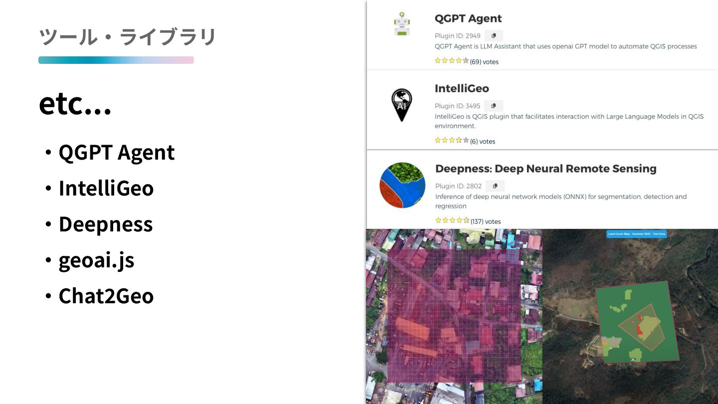 etc... ツール‧ライブラリ ‧QGPT Agent ‧IntelliGeo ‧Deepness ‧geoai.js ‧Chat2Geo