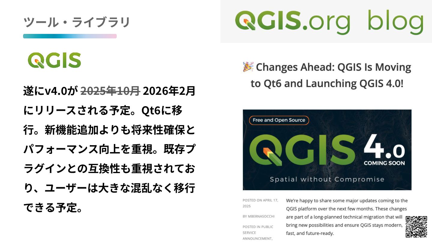 ツール‧ライブラリ 遂にv4.0が 2025年10⽉ 2026年2⽉ にリリースされる予定。Qt6に移 ⾏。新機能追加よりも将来性確保と パフォーマンス向上を重視。既存プ ラグインとの互換性も重視されてお り、ユーザーは⼤きな混乱なく移⾏ できる予定。