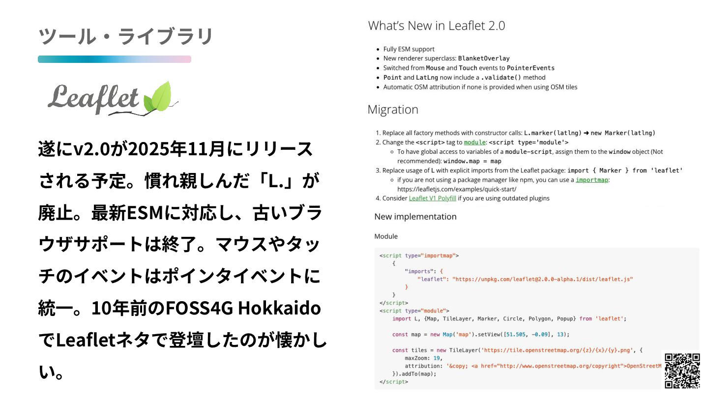 ツール‧ライブラリ 遂にv2.0が2025年11⽉にリリース される予定。慣れ親しんだ「L.」が 廃⽌。最新ESMに対応し、古いブラ ウザサポートは終了。マウスやタッ チのイベントはポインタイベントに 統⼀。10年前のFOSS4G Hokkaido でLeafletネタで登壇したのが懐かし い。