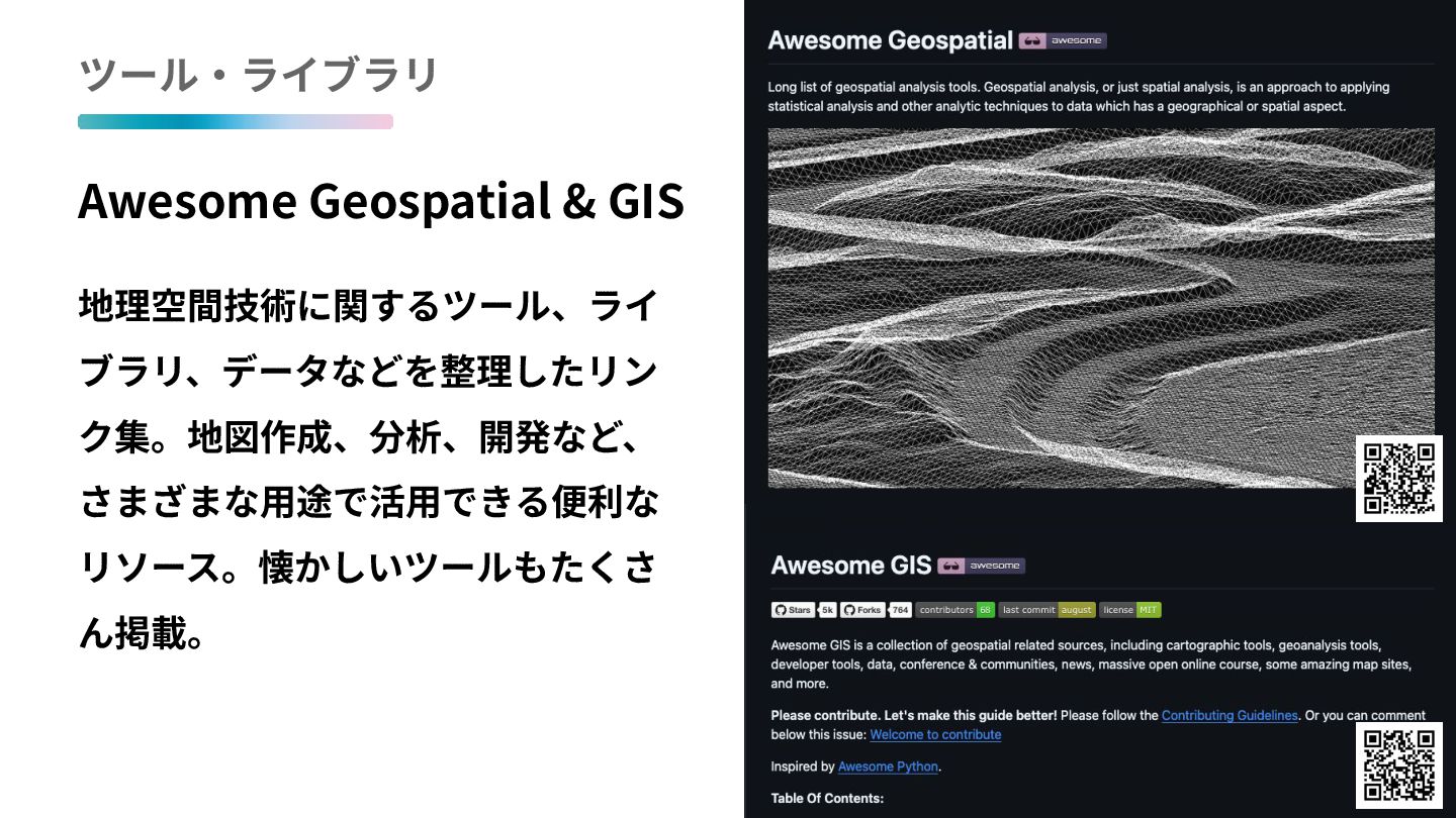 Awesome Geospatial & GIS ツール‧ライブラリ 地理空間技術に関するツール、ライ ブラリ、データなどを整理したリン ク集。地図作成、分析、開発など、 さまざまな⽤途で活⽤できる便利な リソース。懐かしいツールもたくさ