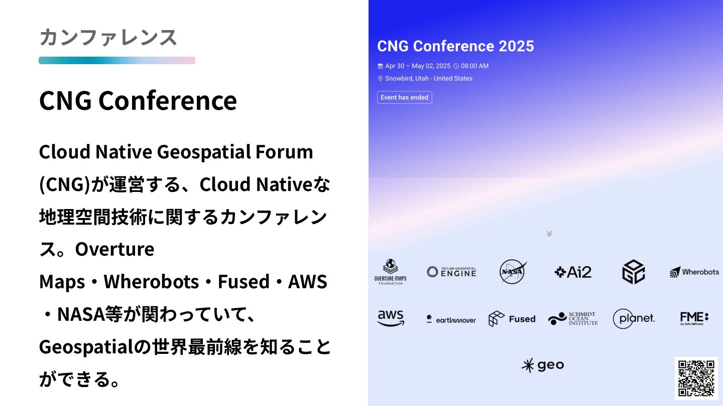 CNG Conference カンファレンス Cloud Native Geospatial Forum (CNG)が運営する、Cloud Nativeな 地理空間技術に関するカンファレン