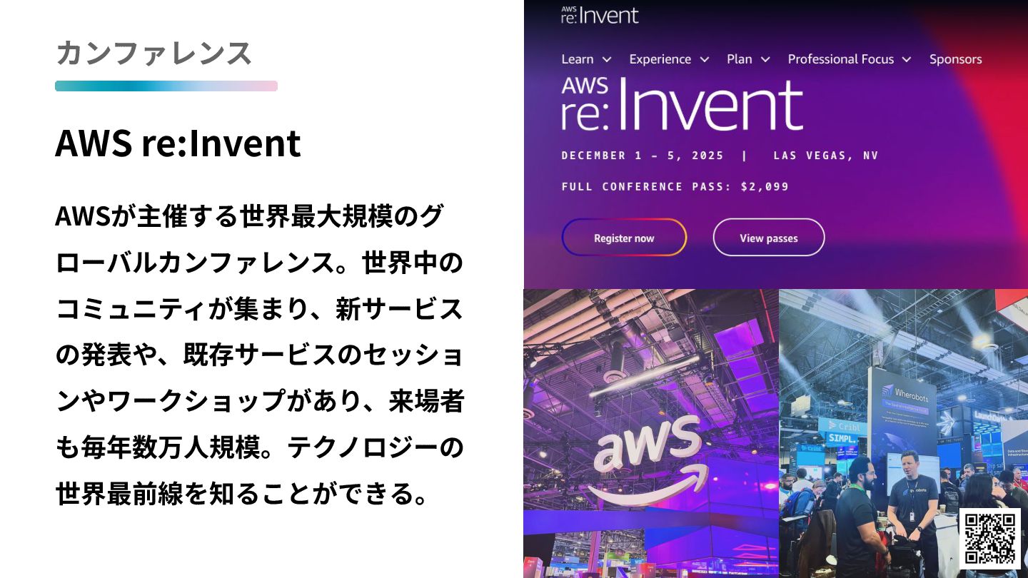 AWS re:Invent カンファレンス AWSが主催する世界最⼤規模のグ ローバルカンファレンス。世界中の コミュニティが集まり、新サービス の発表や、既存サービスのセッショ ンやワークショップがあり、来場者 も毎年数万⼈規模。テクノロジーの 世界最前線を知ることができる。