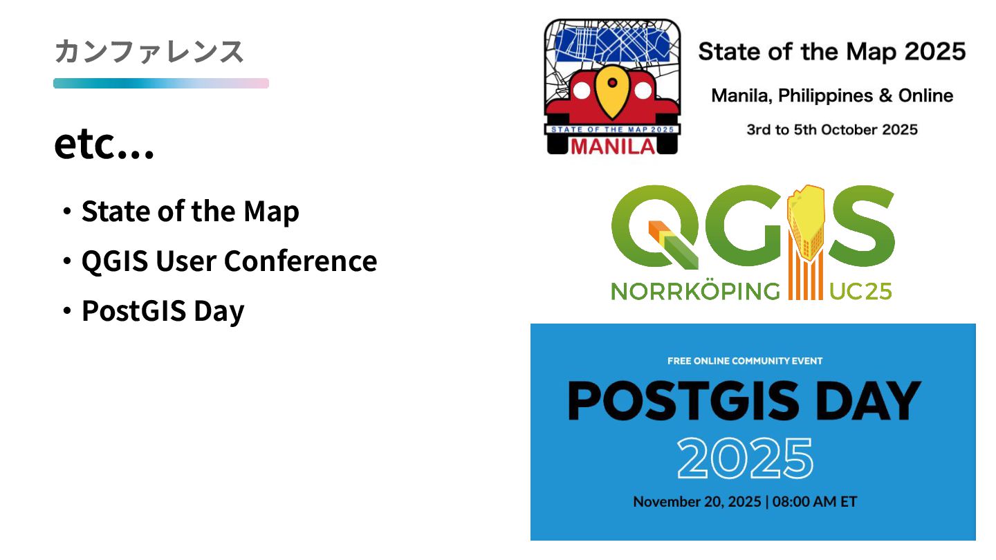 etc... カンファレンス ‧State of the Map ‧QGIS User Conference ‧PostGIS
