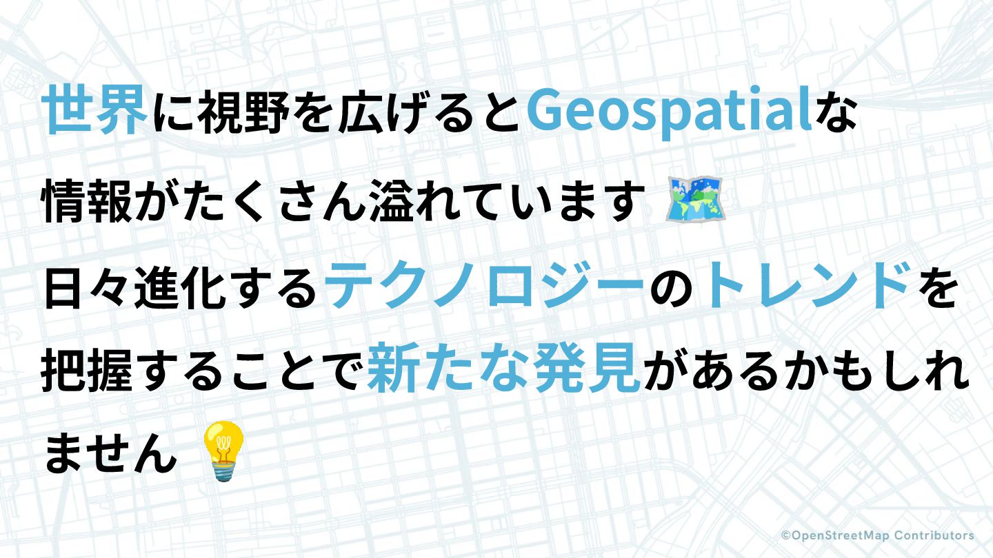 世界に視野を広げるとGeospatialな 情報がたくさん溢れています 🗺 ⽇々進化するテクノロジーのトレンドを 把握することで新たな発⾒があるかもしれ ません 💡
