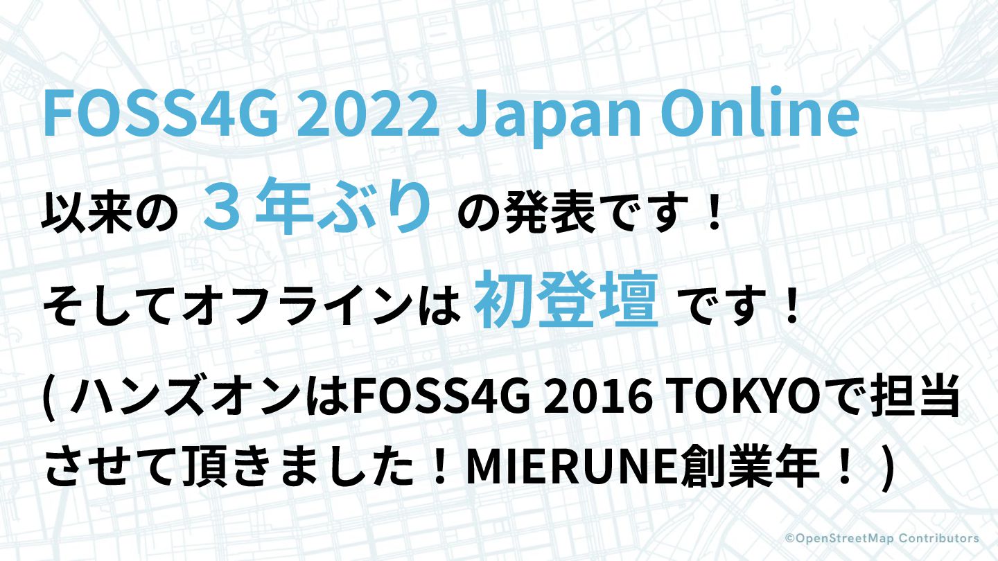 FOSS4G 2022 Japan Online 以来の 3年ぶり の発表です! そしてオフラインは 初登壇 です!